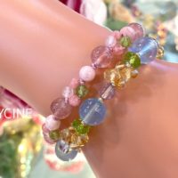 今日紹介させていただく新作の天然石アクセサリーは、 アクアマリン、トパーズ、プレナイト、ローズクォーツの4種類の天然石でデザインしたパワーストーンブレスレットです♪ …