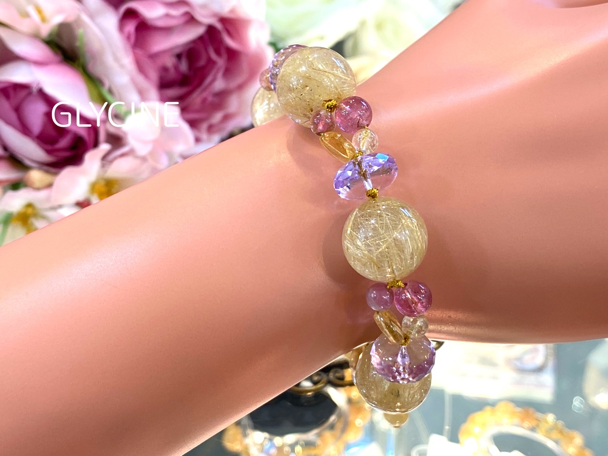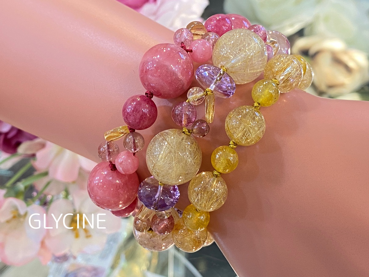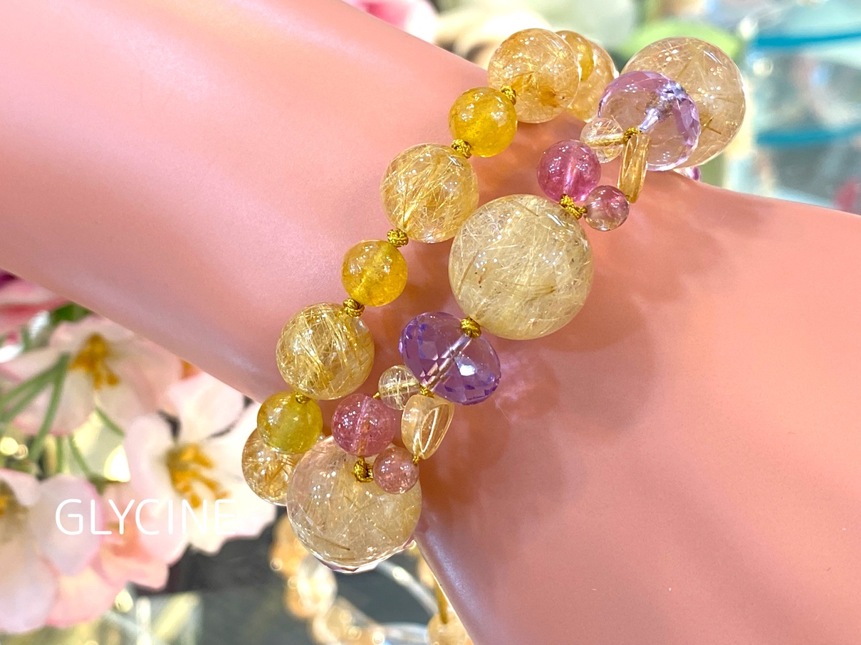 ルチルクォーツとイエローサファイア(プクラジストーン)の2種類の天然石でデザインしたパワーストーンブレスレットとの重ね着けコーデ写真です。