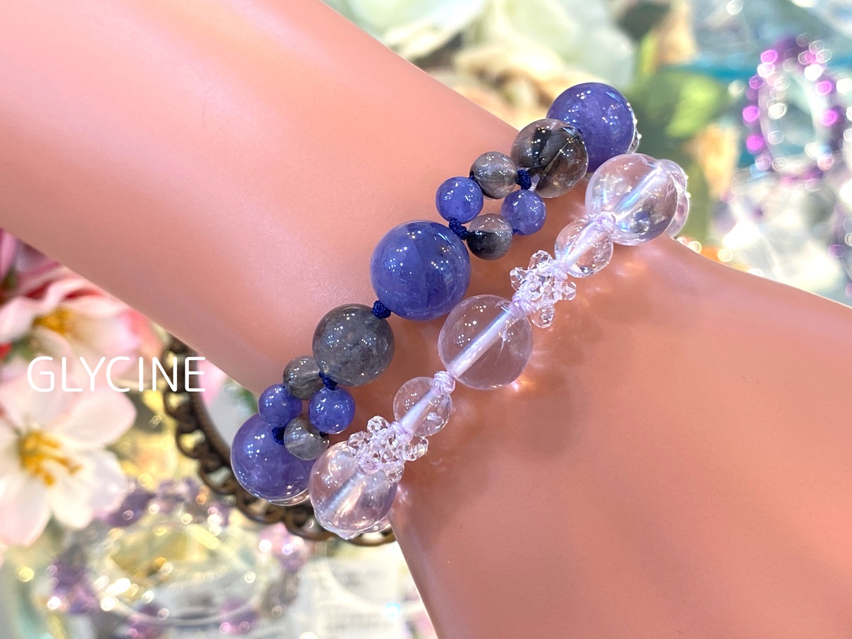 タンザナイト、プラチナクオーツ(ブルッカイトインクオーツ)、ラブラドライトの3種類の天然石でデザインしたパワーストーンブレスレットとの重ね着けコーデ写真です。