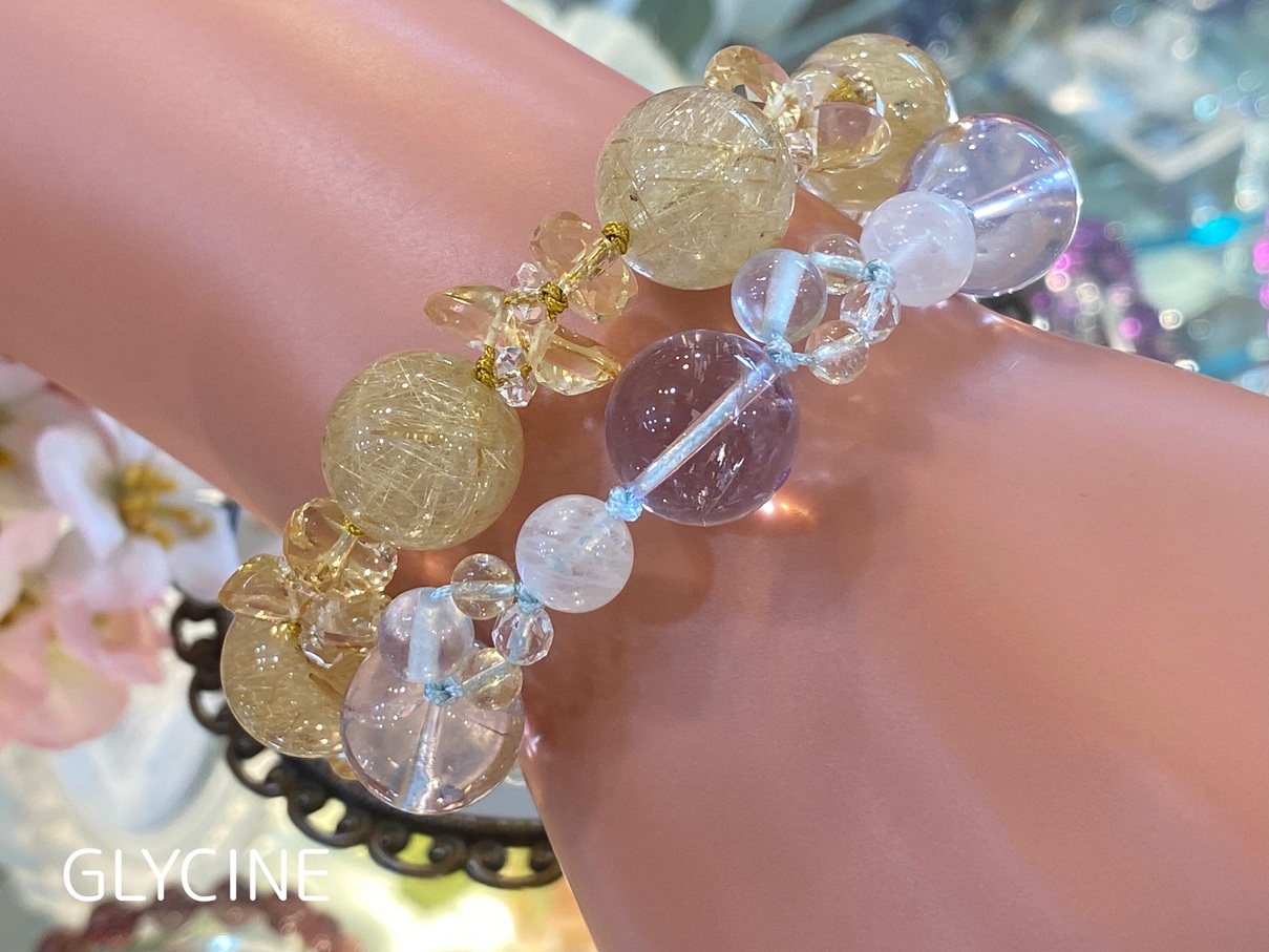 ルチルクォーツ、シトリン、水晶の3種類の天然石でデザインしたパワーストーンブレスレットとの重ね着けコーデ写真です。