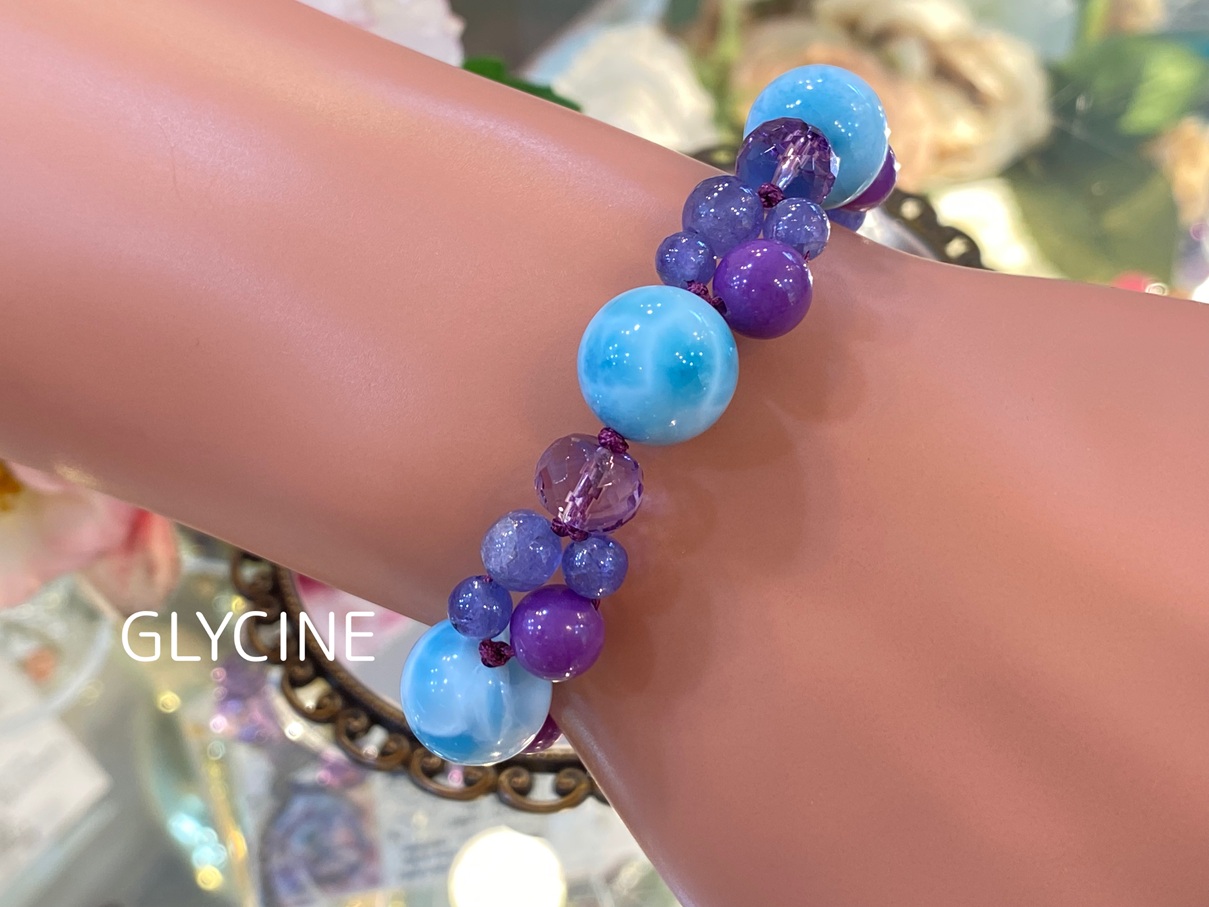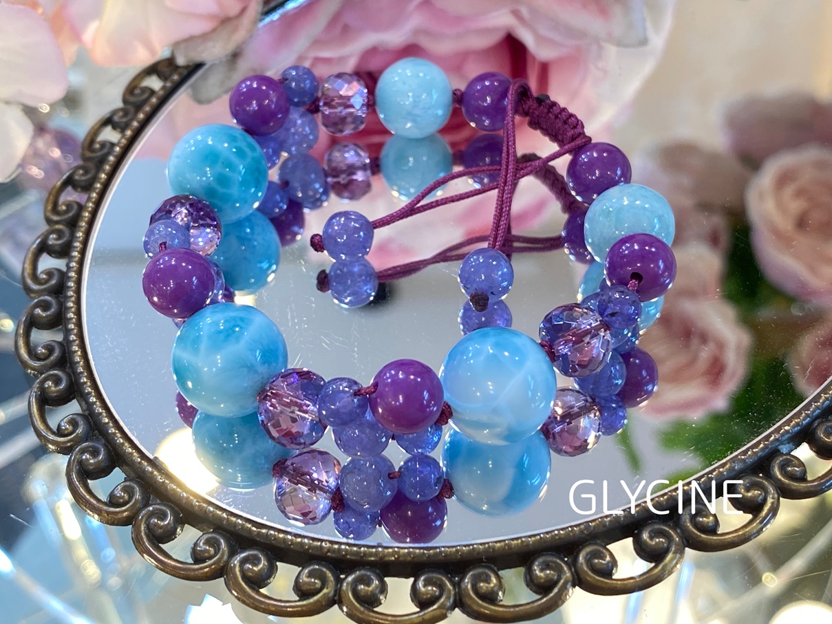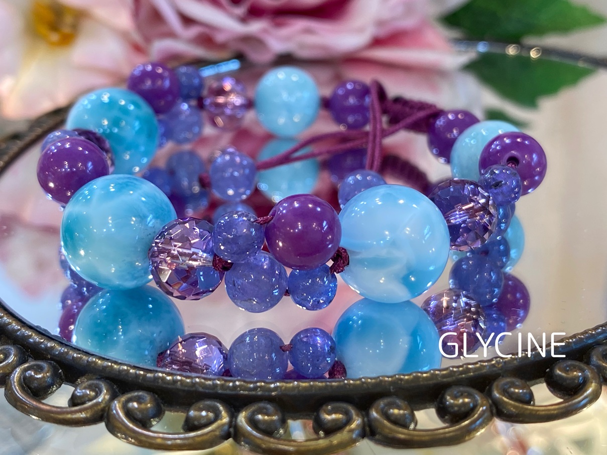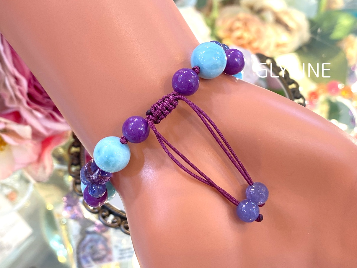 フォスフォシデライト、ラリマー、タンザナイト、アメジストの4種類の天然石でデザインしたパワーストーンブレスレットです。