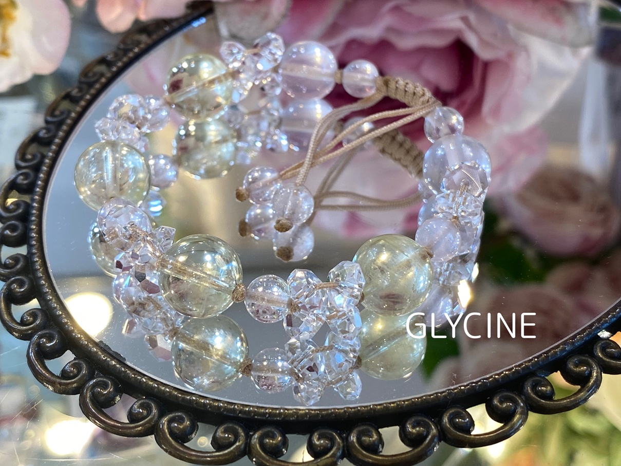 ボタンモチーフの水晶の四葉編みで作った透明なお花模様をアクセントにしています。