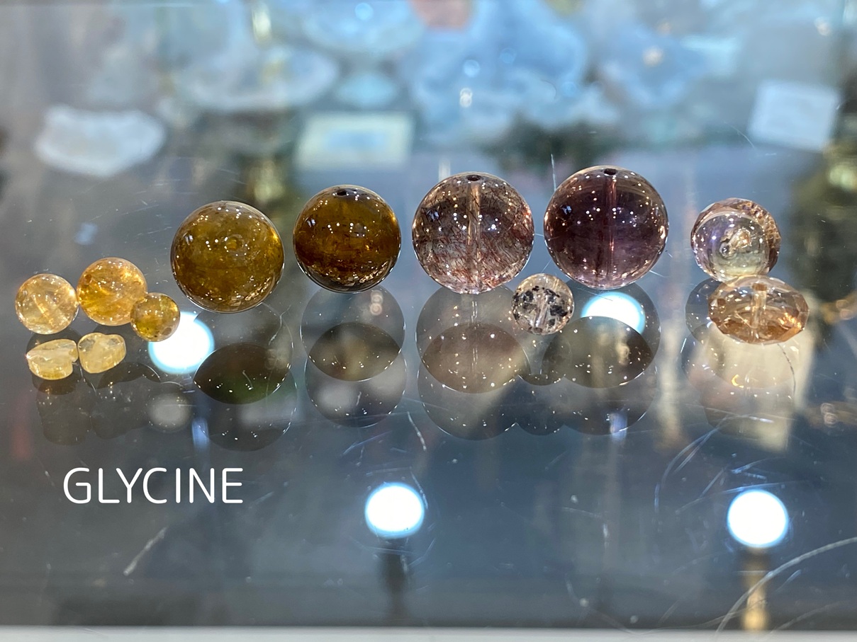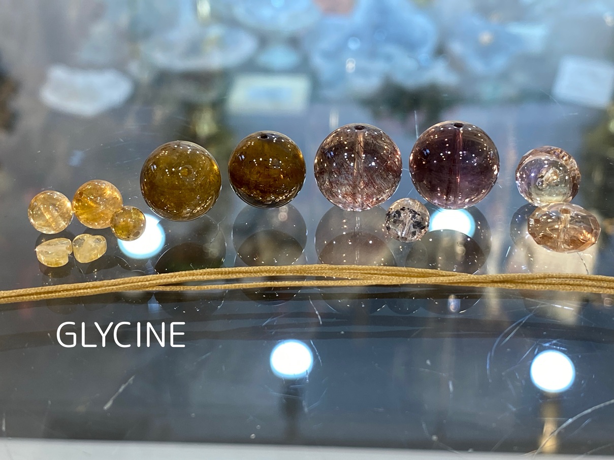 イエロートルマリンは、大きさの違う丸玉を2種類とハートモチーフの合計3種類を。