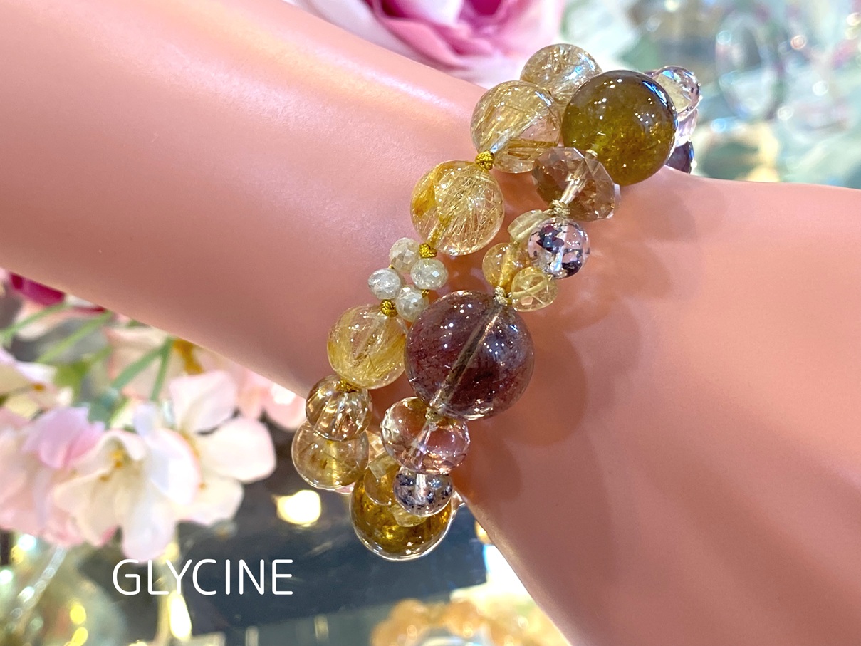 ルチルクォーツ、ダイヤモンドの2種類の天然石でデザインしたパワーストーンブレスレットとの重ね着けコーデ写真です。