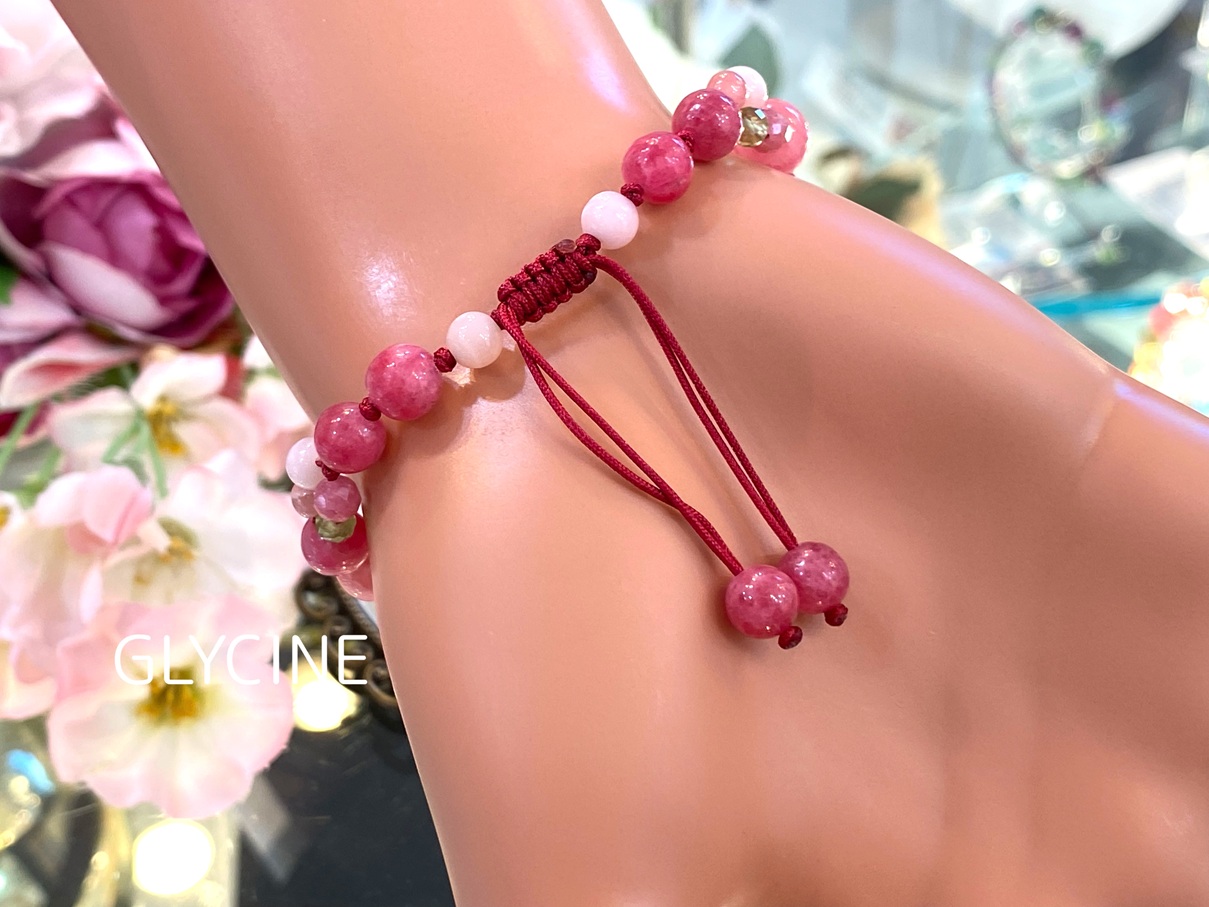 ロードクロサイト(インカローズ)、ロードナイト、ピンクオパール、ペリドットの4種類の天然石でデザインしたパワーストーンブレスレットです♪