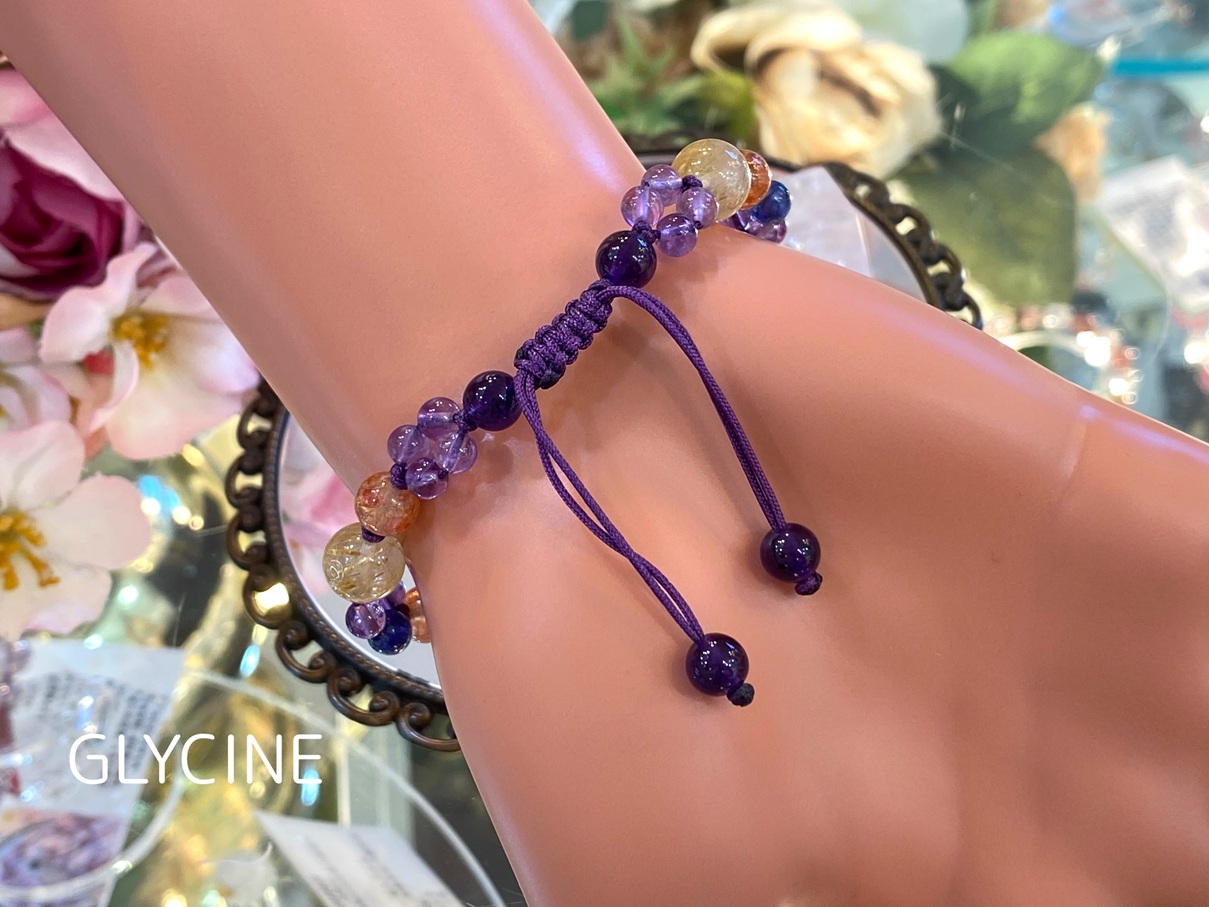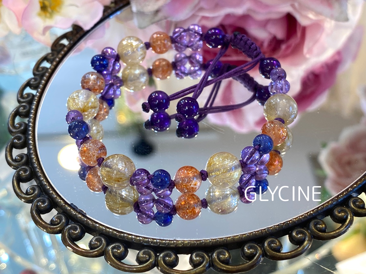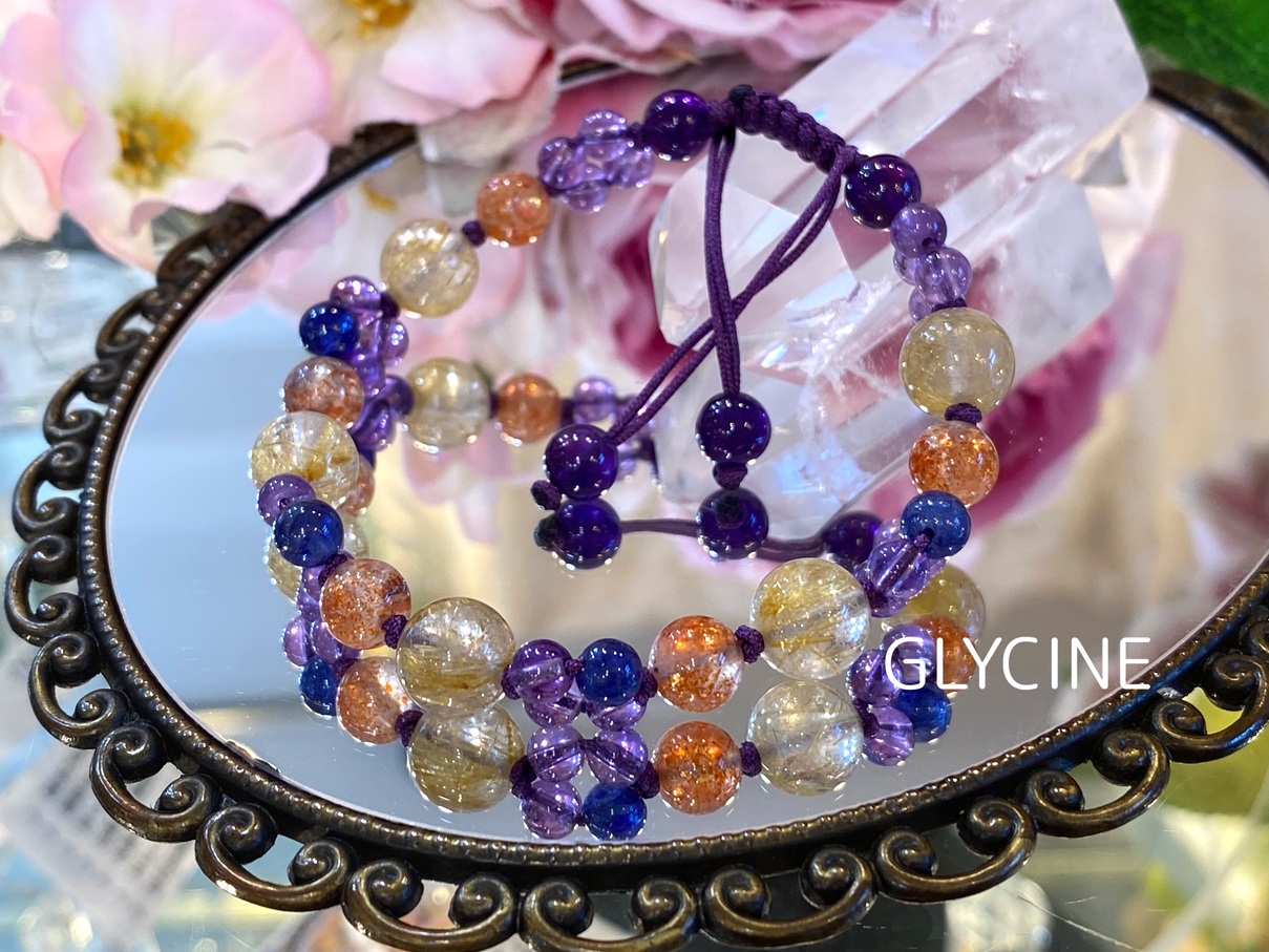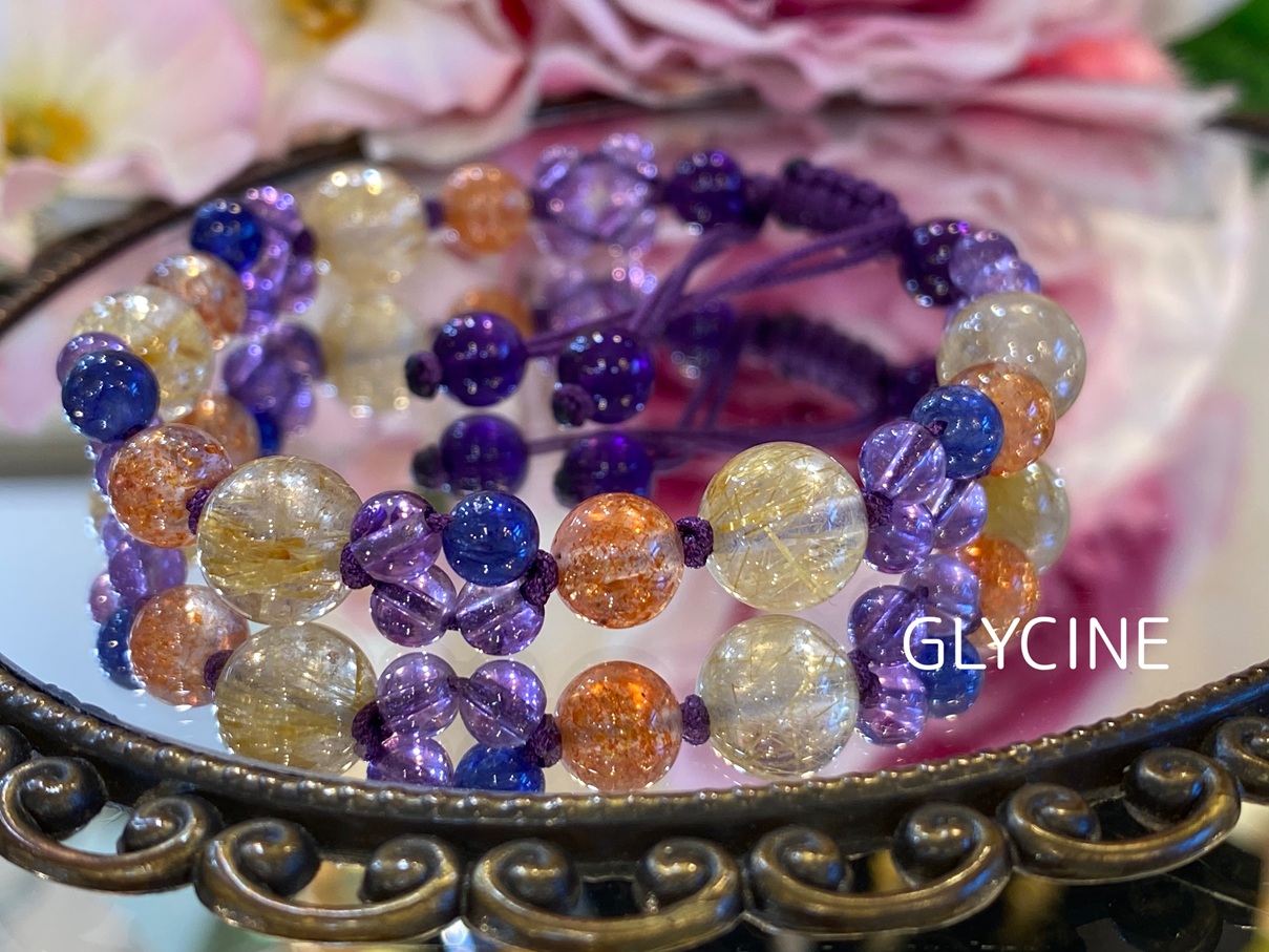 ルチルクォーツ、サンストーン、サファイア、アメジストの4種類の天然石でデザインしたパワーストーンブレスレットです!