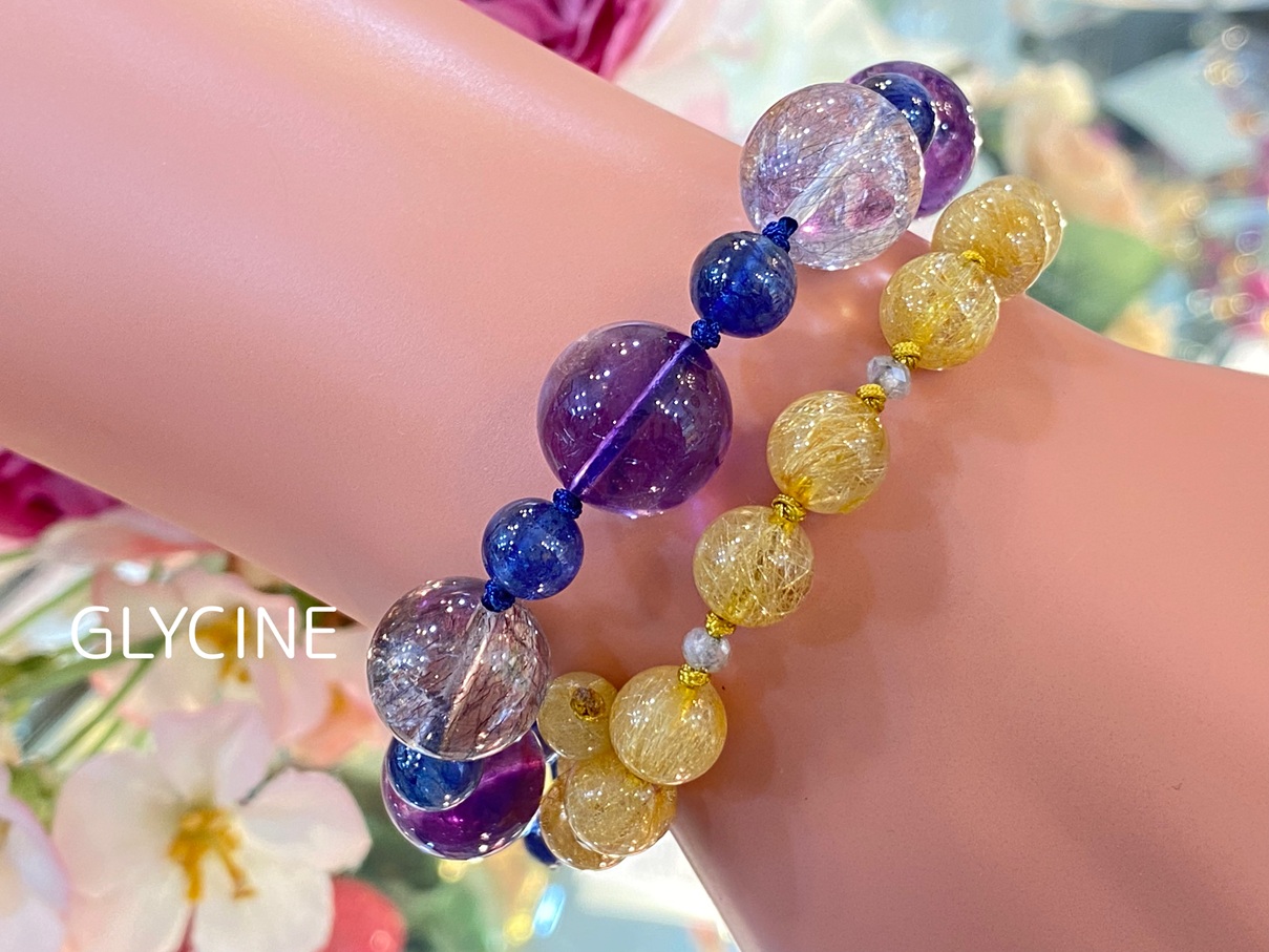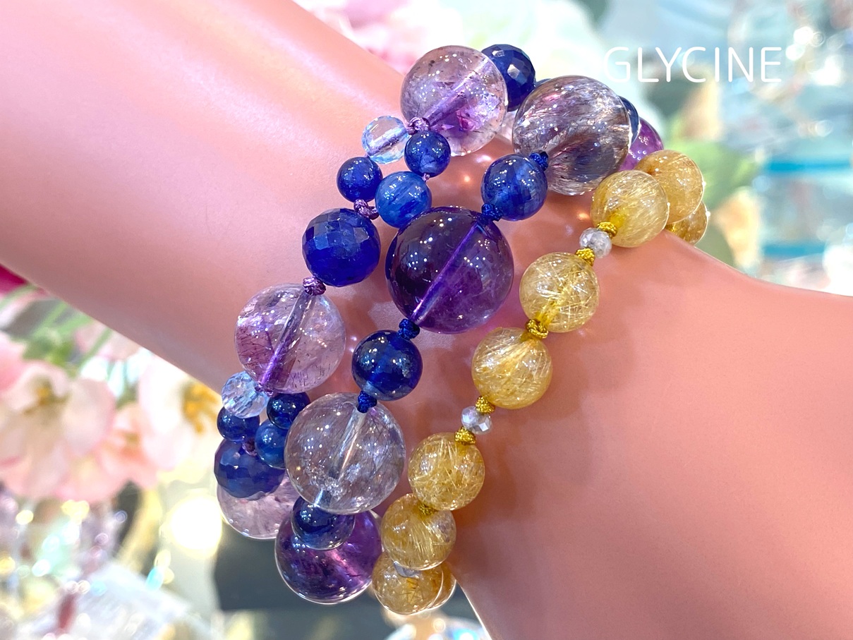 アメジストエレスチャル、サファイア、カイヤナイト、ブルートパーズの4種類の天然石でデザインしたパワーストーンブレスレットとのコーデも素敵ですし♪