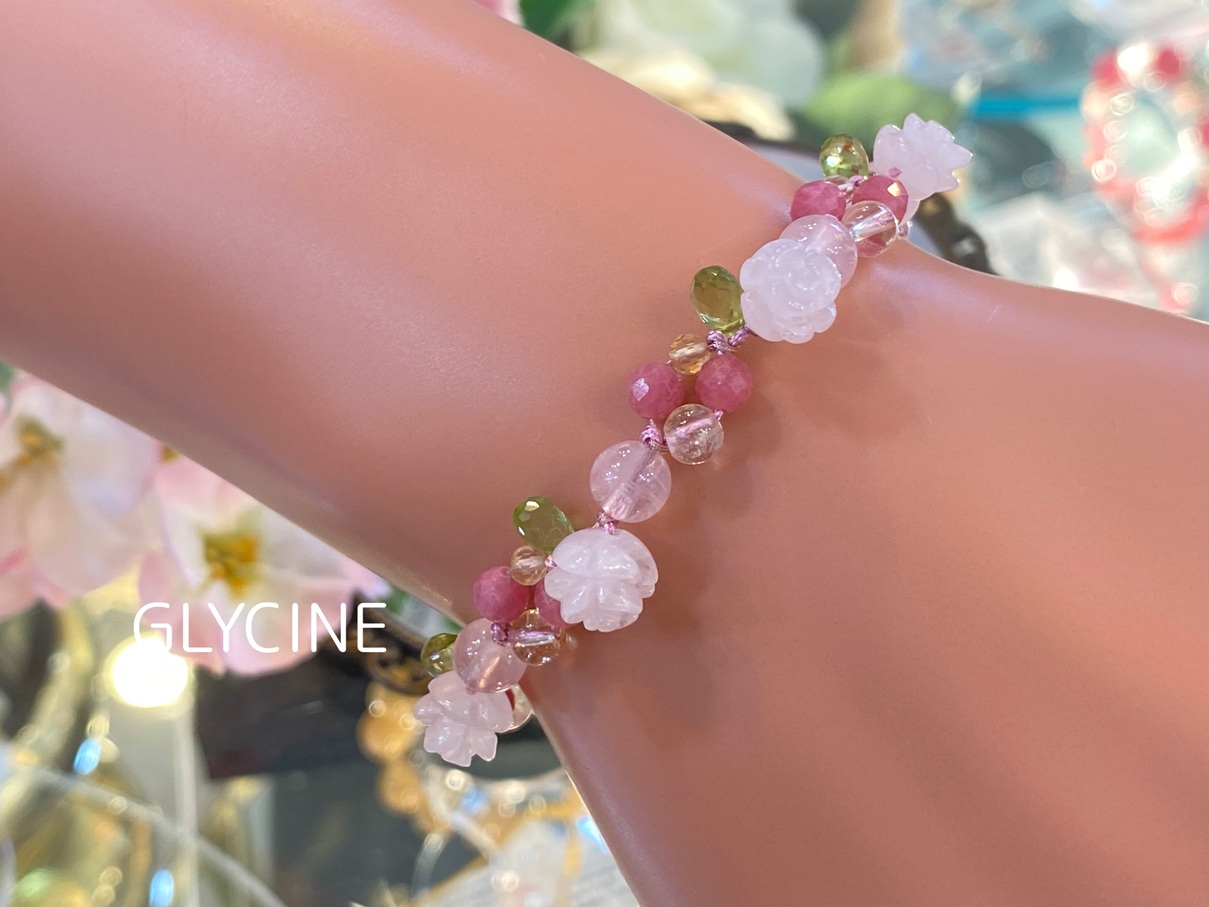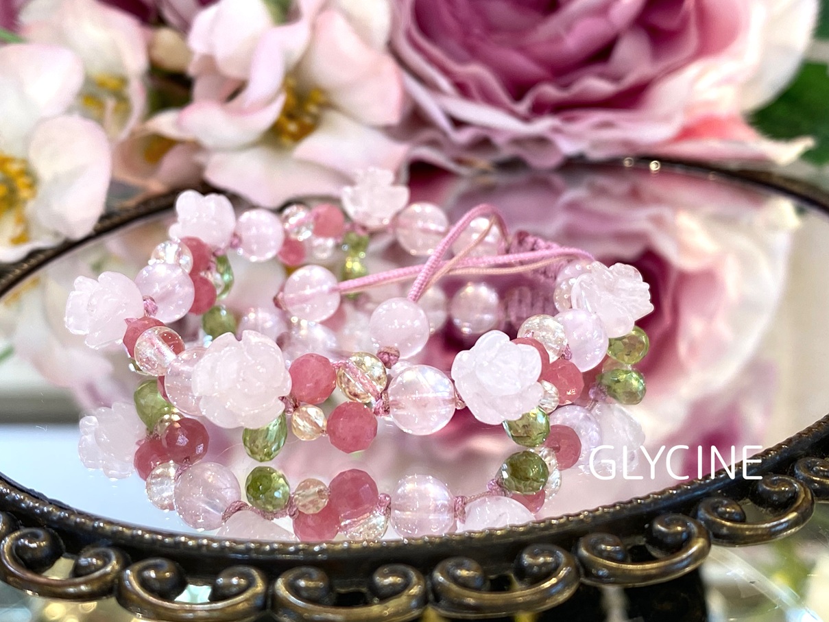 ローズクォーツ、ロードナイト、ペリドット、シトリンの4種類の天然石でデザインしていますよ(*^^*)
