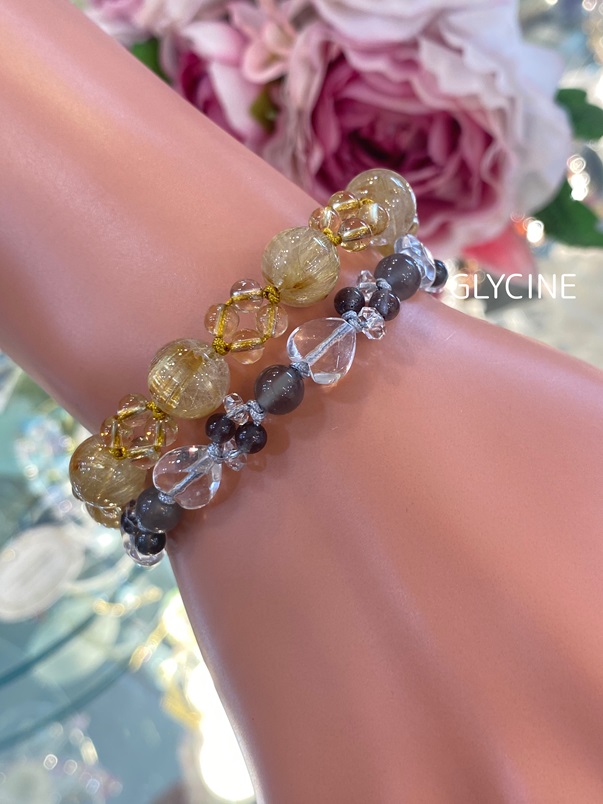 ルチルクオーツとシトリンのパワーストーンブレスレットとの重ね着けコーデ写真です。