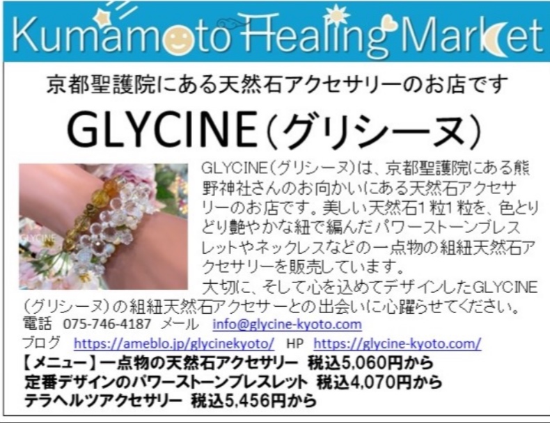 ヒーリングマーケットin熊本に行かれる予定の方がいらっしゃいましたら、ぜひぜひGlycine(グリシーヌ)のブースにもお立ち寄りくださいませ!
