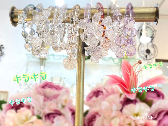 キラキラなGlycine(グリシーヌ)の透明すぎる水晶を贅沢に使った新作のパワーストーンブレスレットをたくさん作成中でございます~(*^^*)