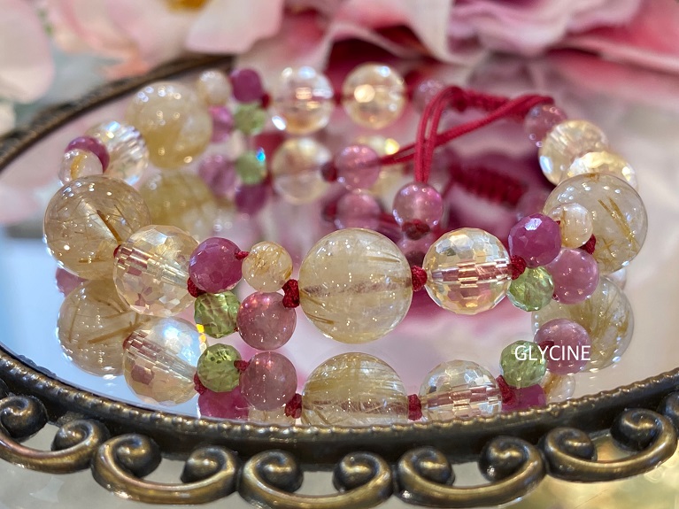ルチルクオーツ、ルビー、シトリン、ピンクトルマリンシリカ、ペリドットの5種類の天然石を素敵なパワーストーンブレスレットに仕上げるために使ったのは、