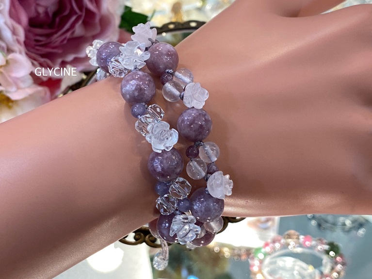 写真下側が、昨日紹介したレピドライトと水晶のパワーストーンブレスレットです。
