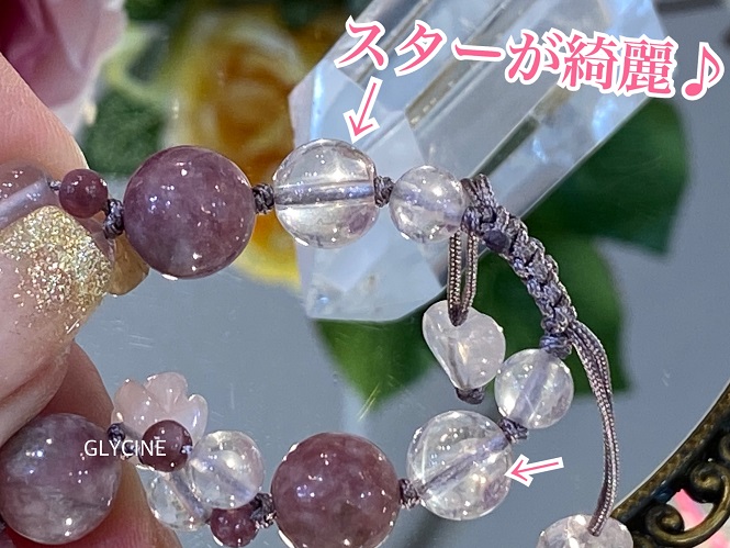 今日紹介している新作のパワーストーンブレスレットに使ったスターローズクオーツにはスターがハッキリ見える粒がたくさん♪