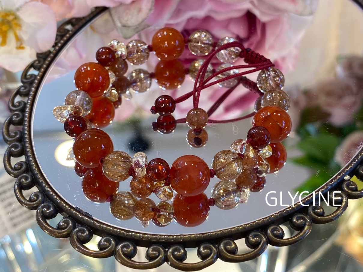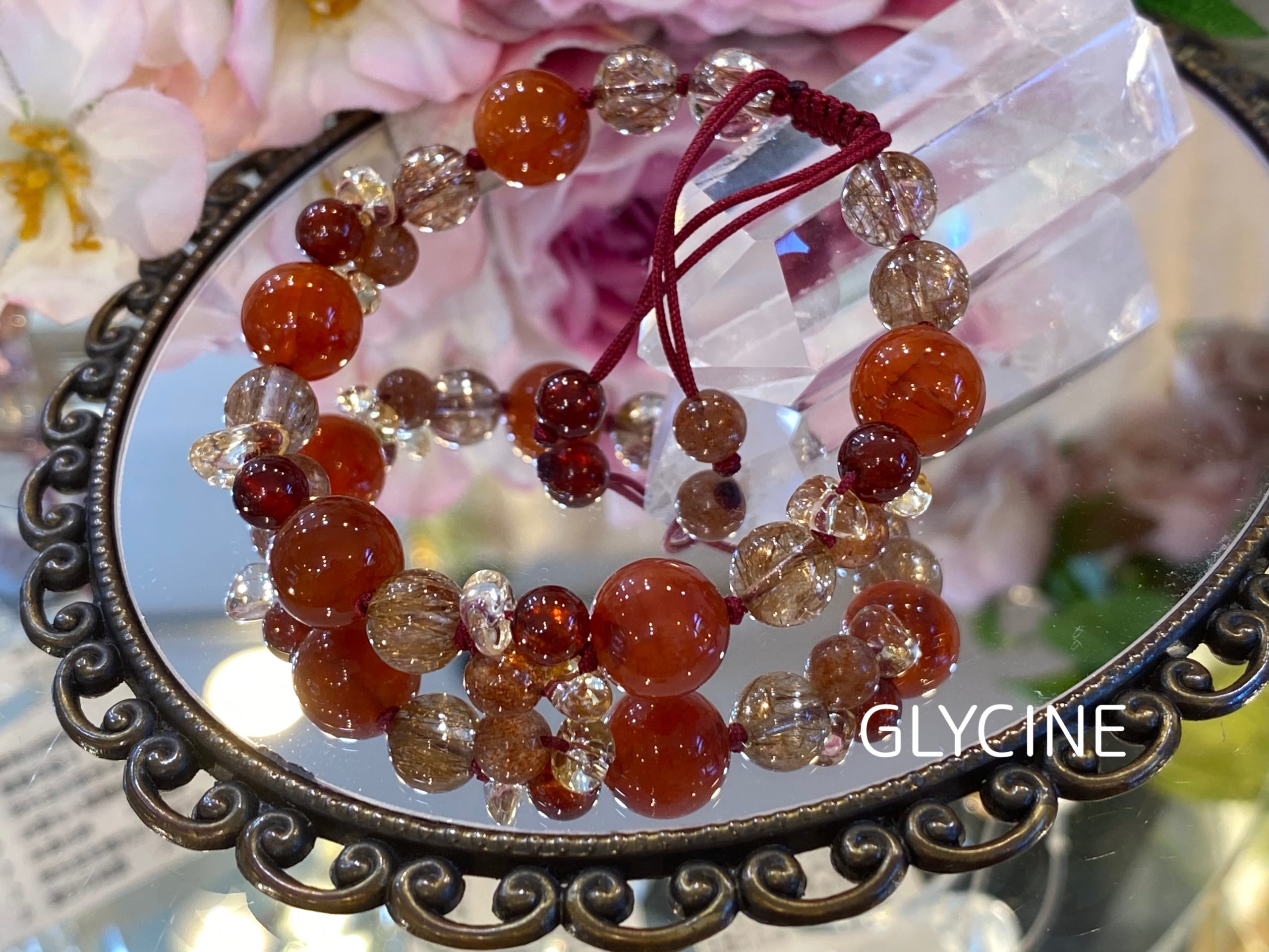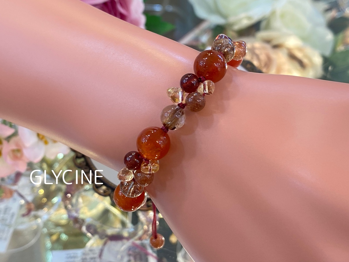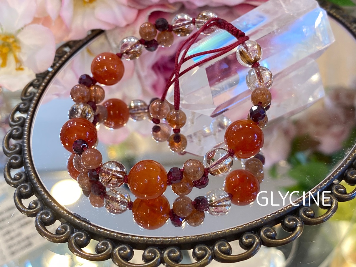 カーネリアン、ルチルクォーツ、サンストーン、ガーネット、シトリンの5種類の天然石でデザインしました。