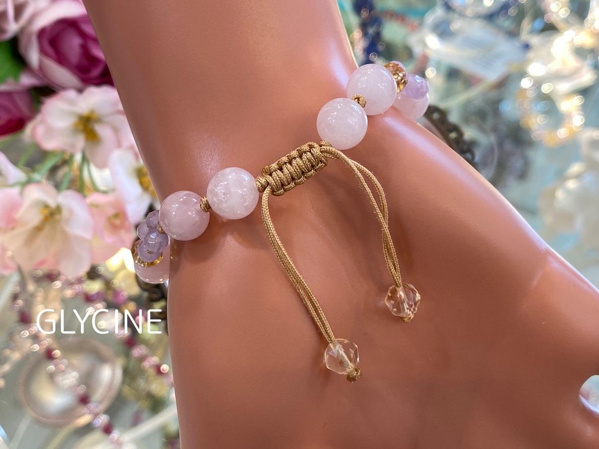 穏やかで楽しい気持ちになって『ワタシシアワセダワ~♡』って、自分の中にある幸せを再確認するタイミングになったらいいなって思ってモルガナイトを使ったパワーストーンブレスレットをデザインしています。