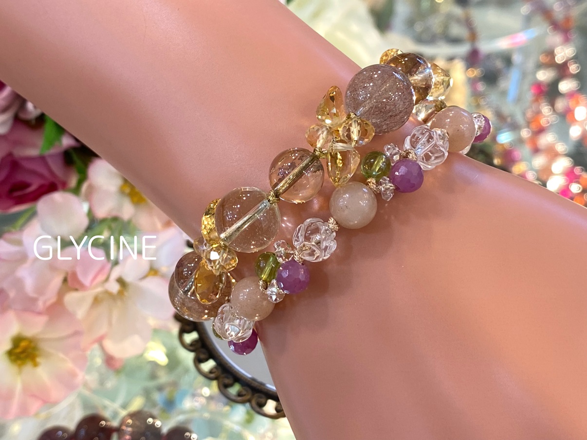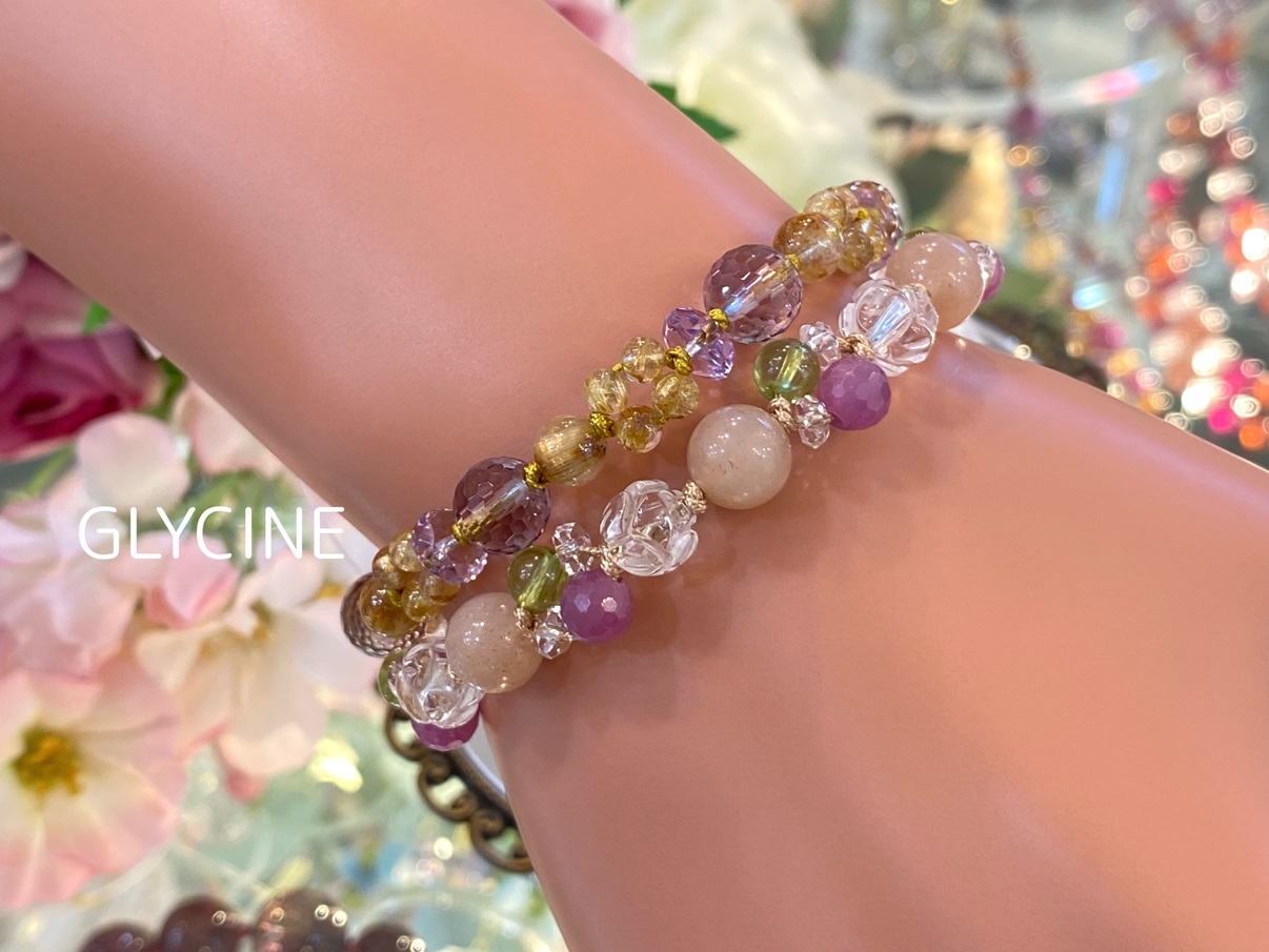 ルチルクォーツ、アメジストの2種類の天然石でデザインしたパワーストーンブレスレットとの重ね着けコーデ写真です。