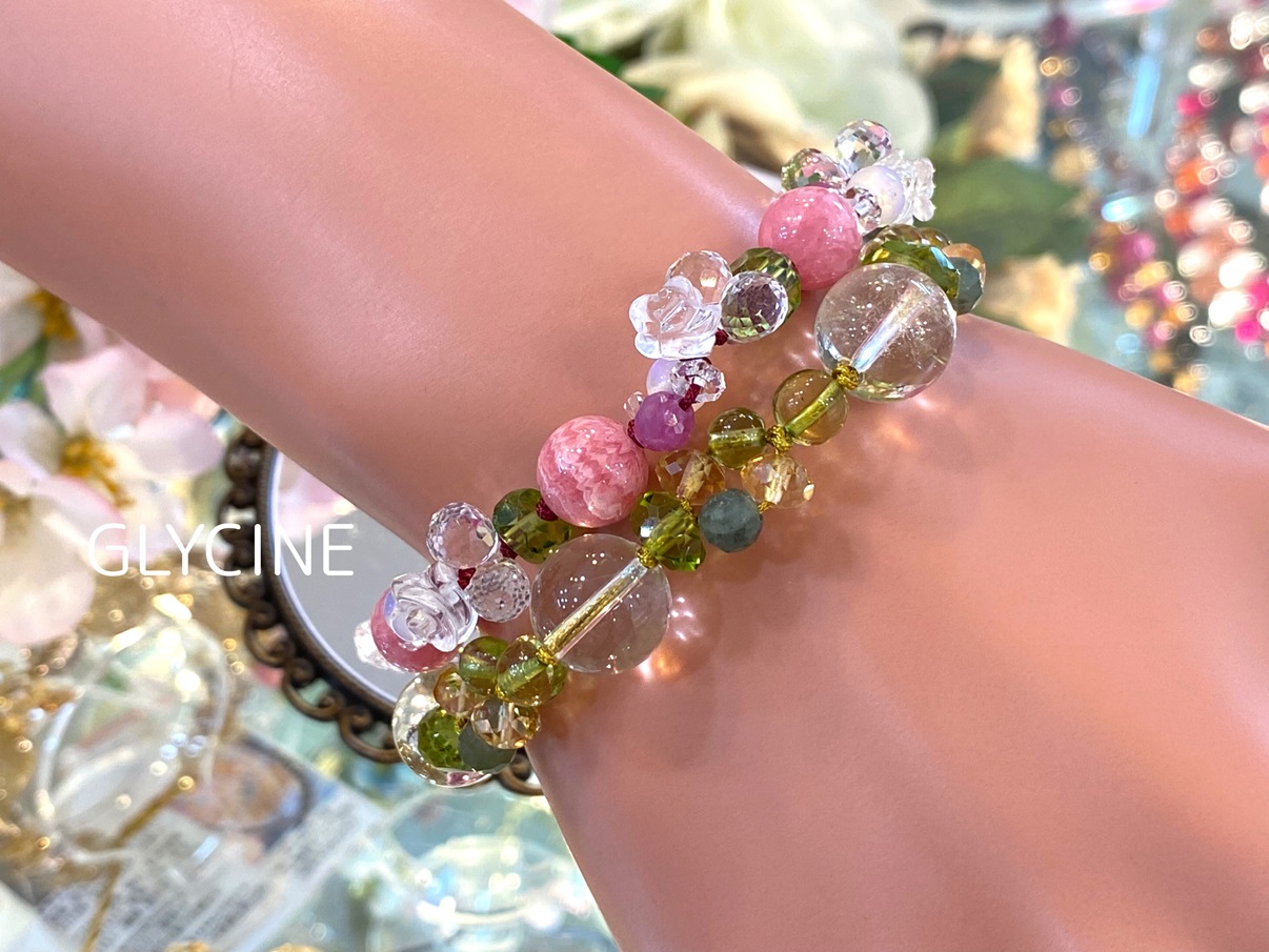 ルビー、ロードクロサイト(インカローズ)、ペリドット、プレシャスオパール、水晶の5種類の天然石でデザインしたパワーストーンブレスレットとの重ねコーデ写真です。