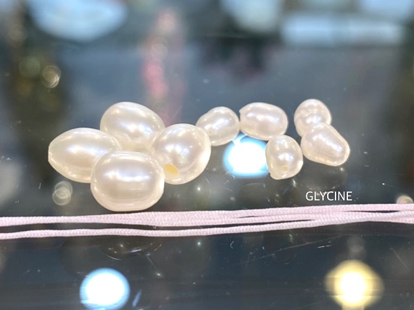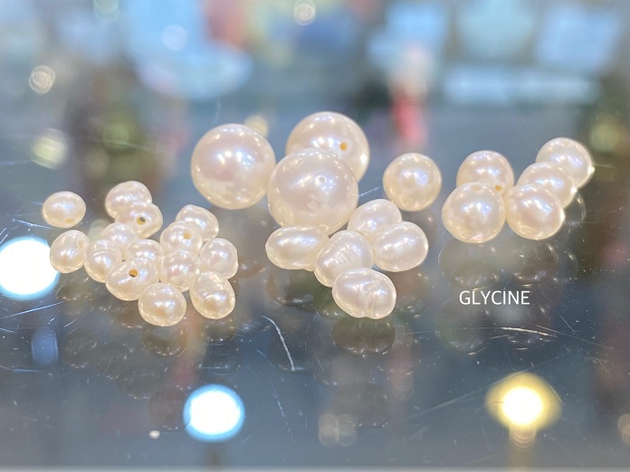 形や大きさの違う白い色の淡水パールをたくさん用意しました。