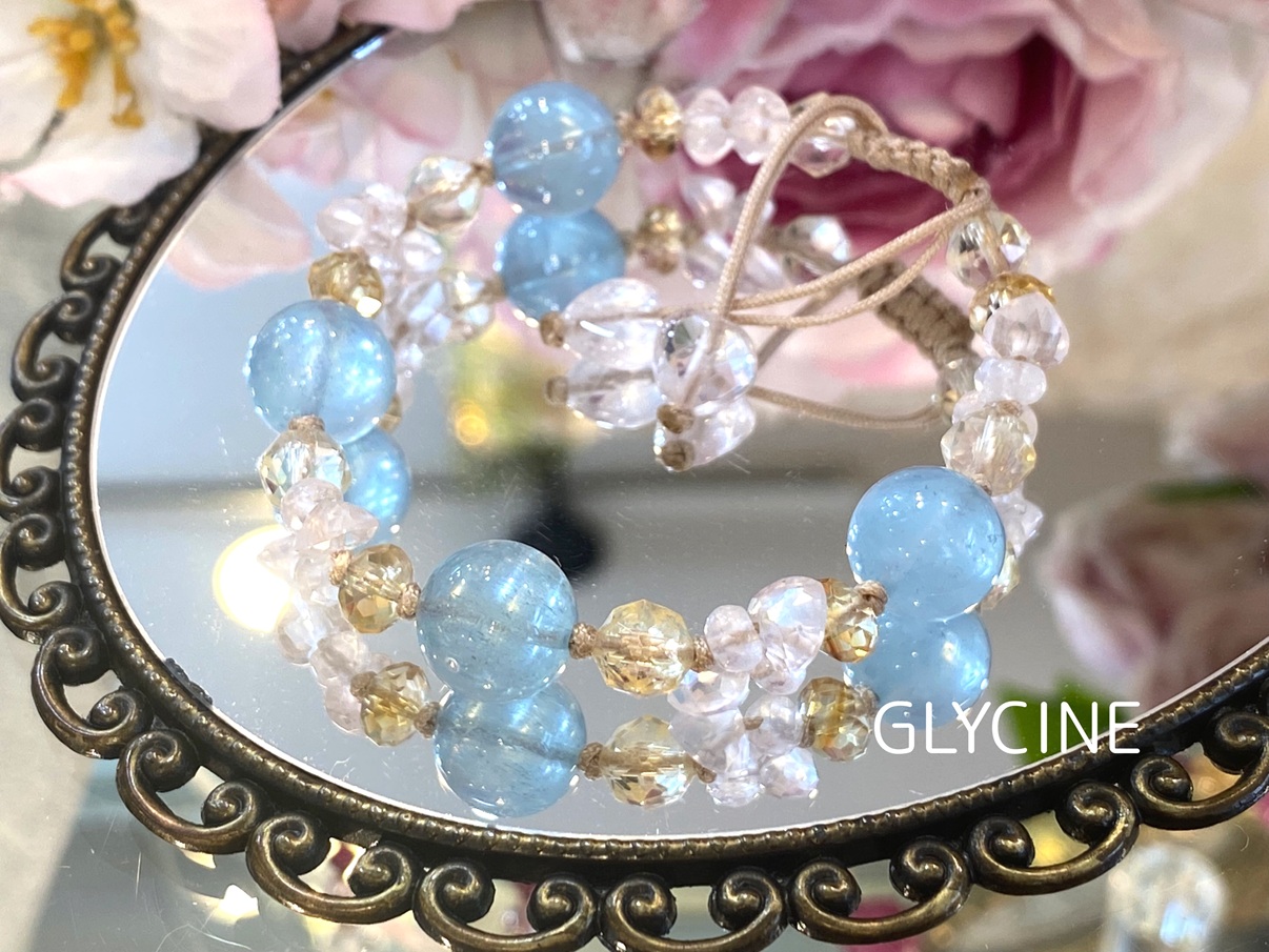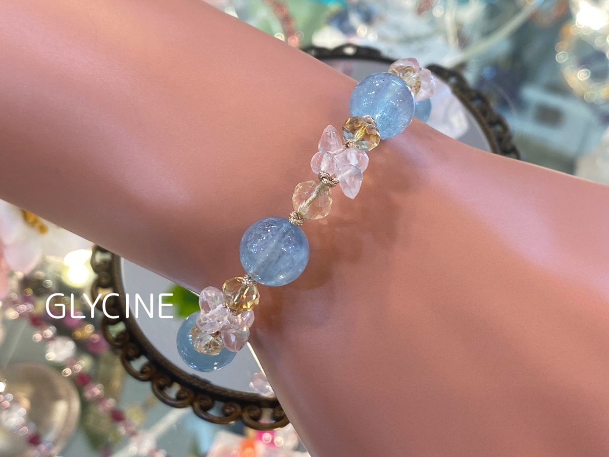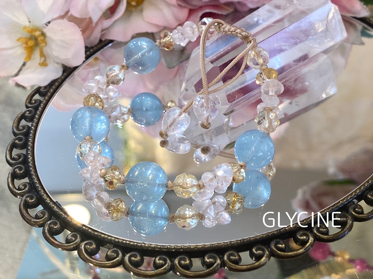Glycine(グリシーヌ)でもアクアマリンを使ったパワーストーンブレスレットは人気で、軽やかで可愛いお色のものは特にご好評です♪