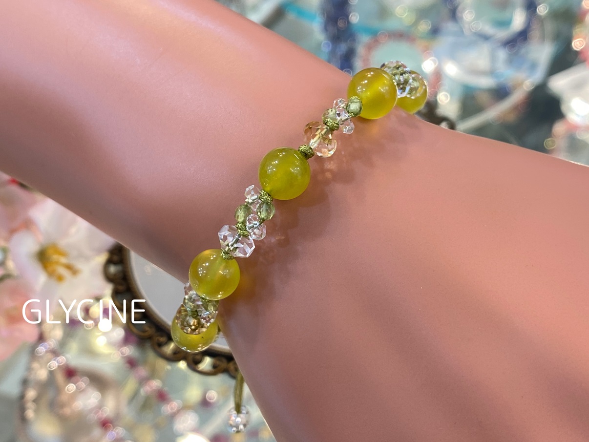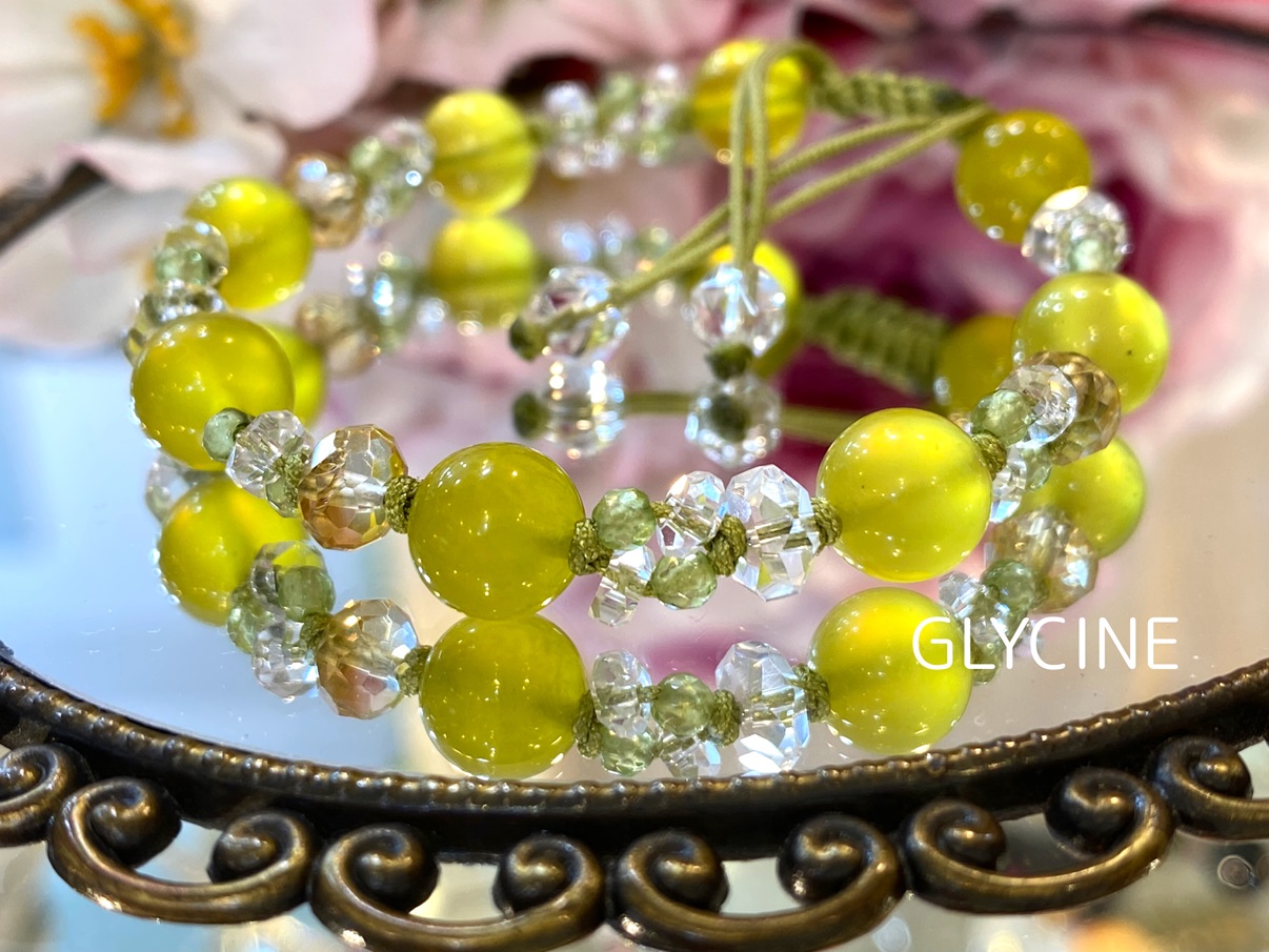 水晶やシトリン、ペリドットを散りばめて、可憐な黄色いミモザの花をイメージしてみたんですよ♪