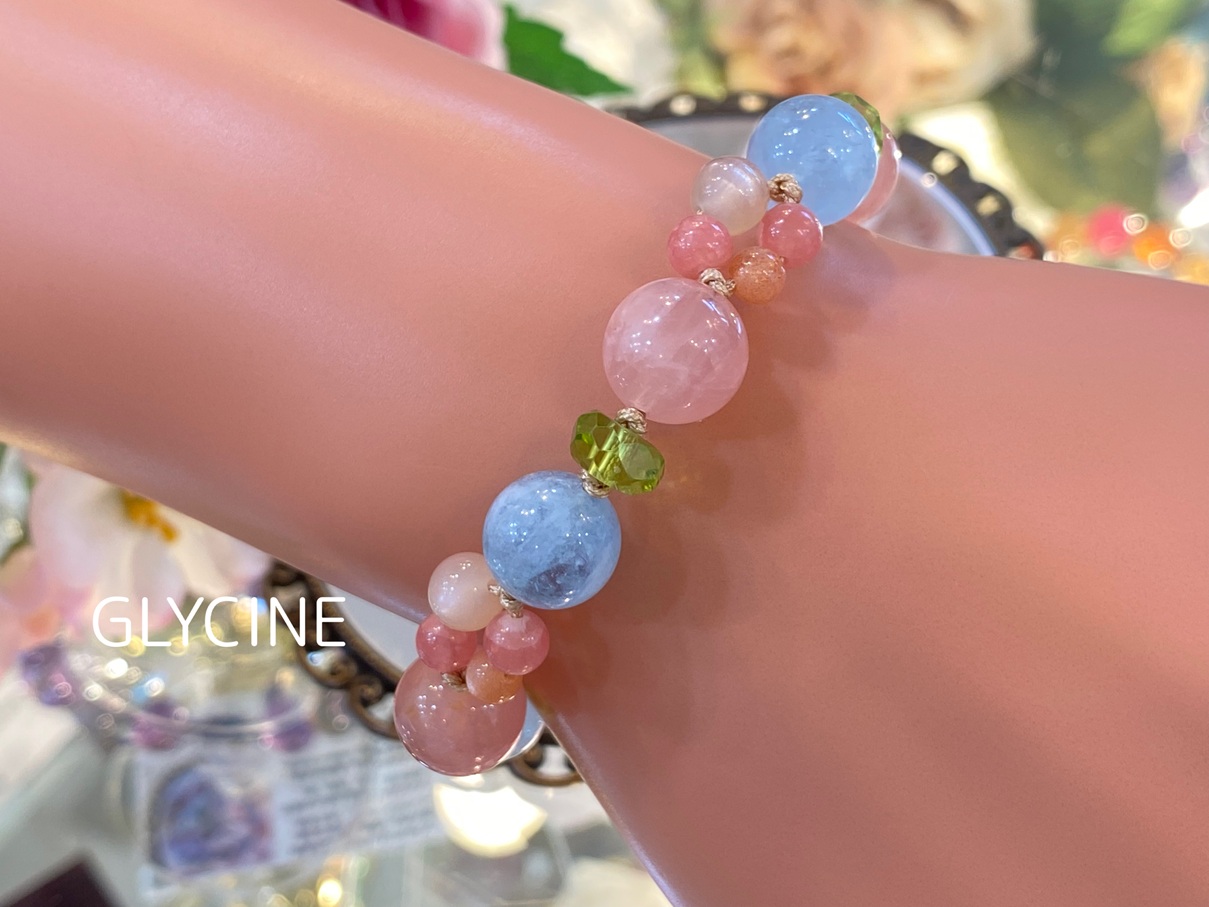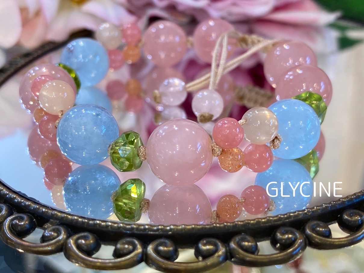 ディープローズクオーツ、アクアマリン、ロードクロサイト(インカローズ)、ペリドット、ムーンストーンの5種類の天然石でデザインしました。