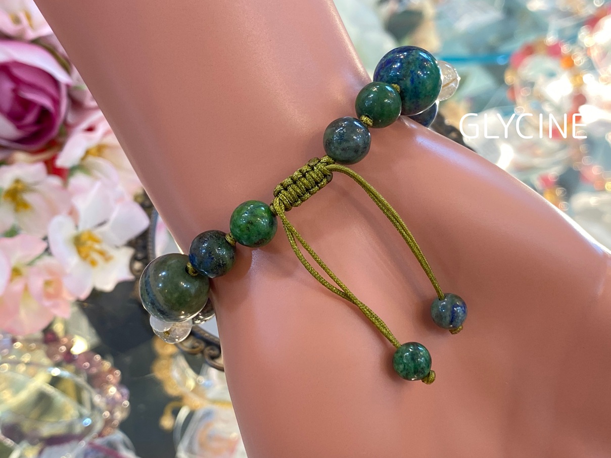 手首中央部分は大玉のアズライトマラカイトを使ってデザインしていますが、