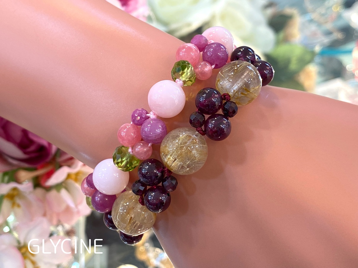 ピンクオパール、ルビー、ロードクロサイト(インカローズ)、ペリドットの4種類の天然石でデザインしたパワーストーンブレスレットとの重ね着けコーデ写真です。