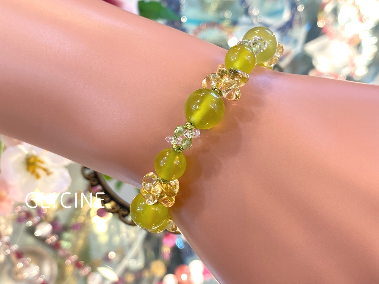 明るい黄緑色のサーペンチン(蛇紋石)にシトリンとペリドットと水晶を合わせてデザインした、黄色いミモザみたいなパワーストーンブレスレットです!
