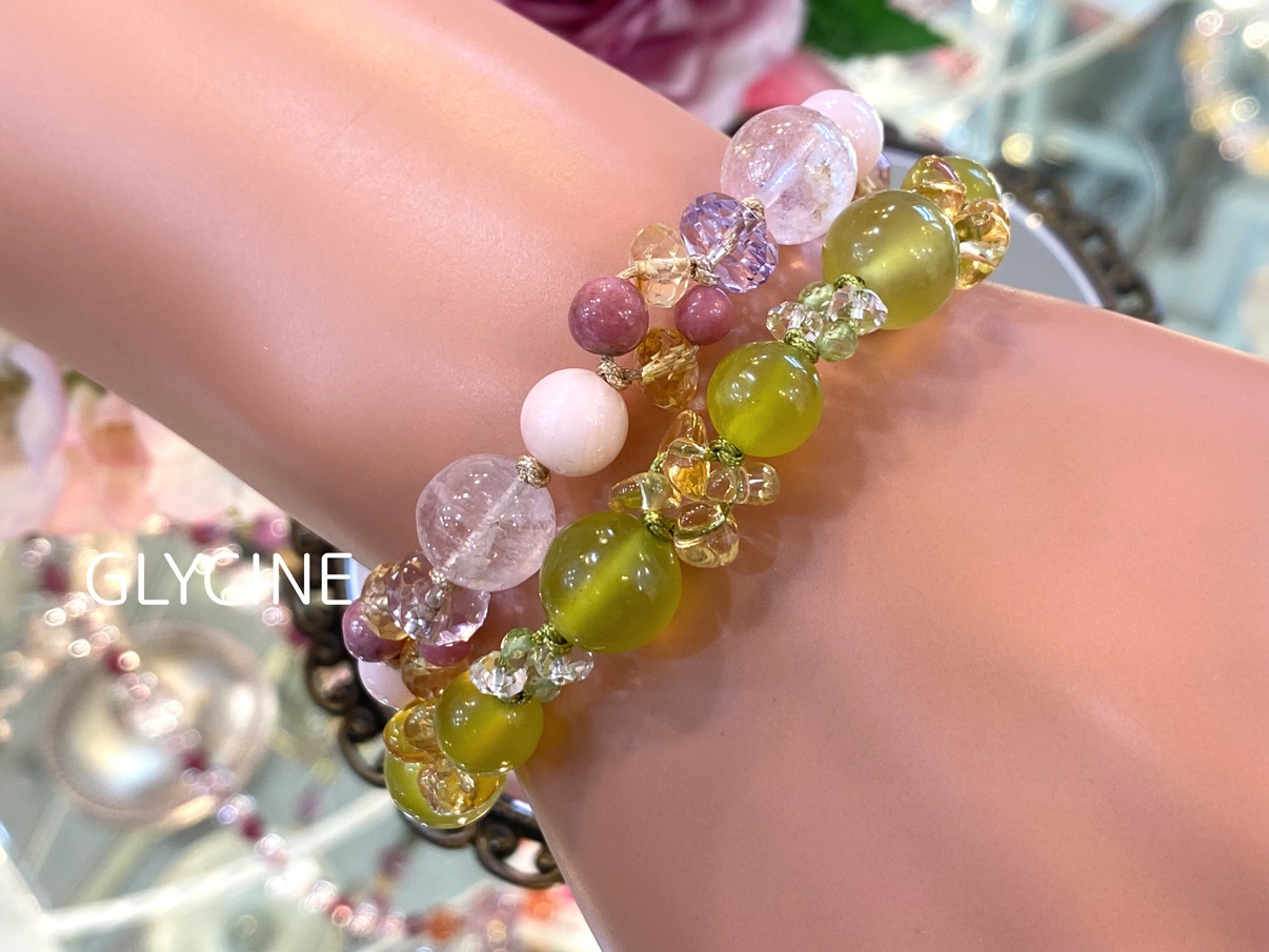 クンツァイト、ピンクオパール、ロードナイト、シトリン、アメジストの5種類の天然石でデザインしたパワーストーンブレスレットとの重ね着けコーデ写真です。