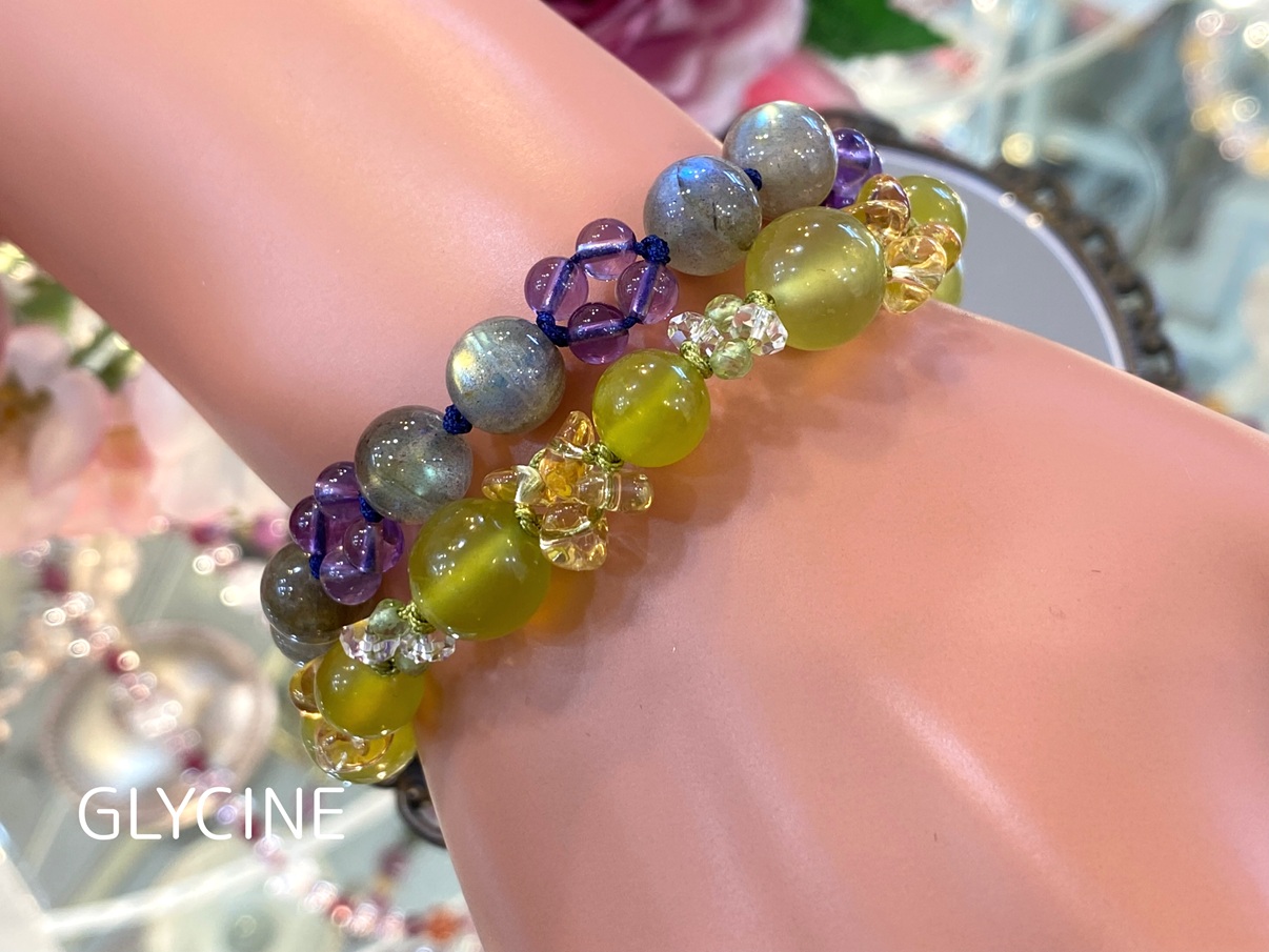 ラブラドライト、アメジストの2種類の天然石でデザインしたパワーストーンブレスレットとの重ね着けコーデ写真です。