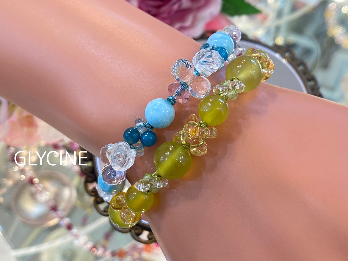 ラリマー、アパタイト、アメジスト、水晶の4種類の天然石でデザインしたパワーストーンブレスレットとの重ね着けコーデ写真です。