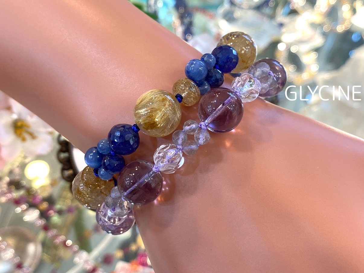 ルチルクォーツ、サファイア、カイヤナイトの3種類の天然石でデザインしたパワーストーンブレスレットとの重ね着けコーデ写真です。