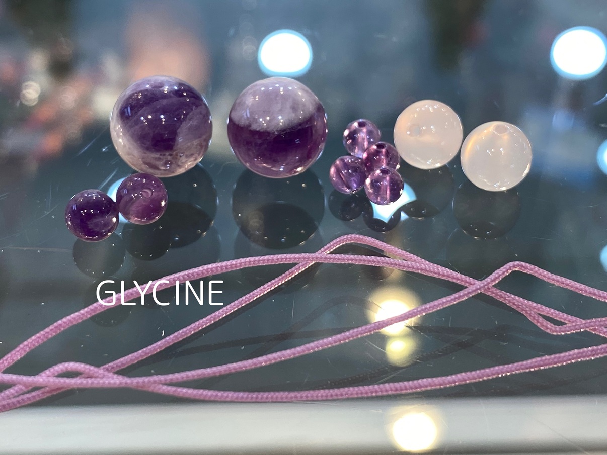 ケープアメジストと呼ばれる紫色の中に白い模様が見えるタイプのアメジストは、大粒と大きくない粒を2種類選びました。