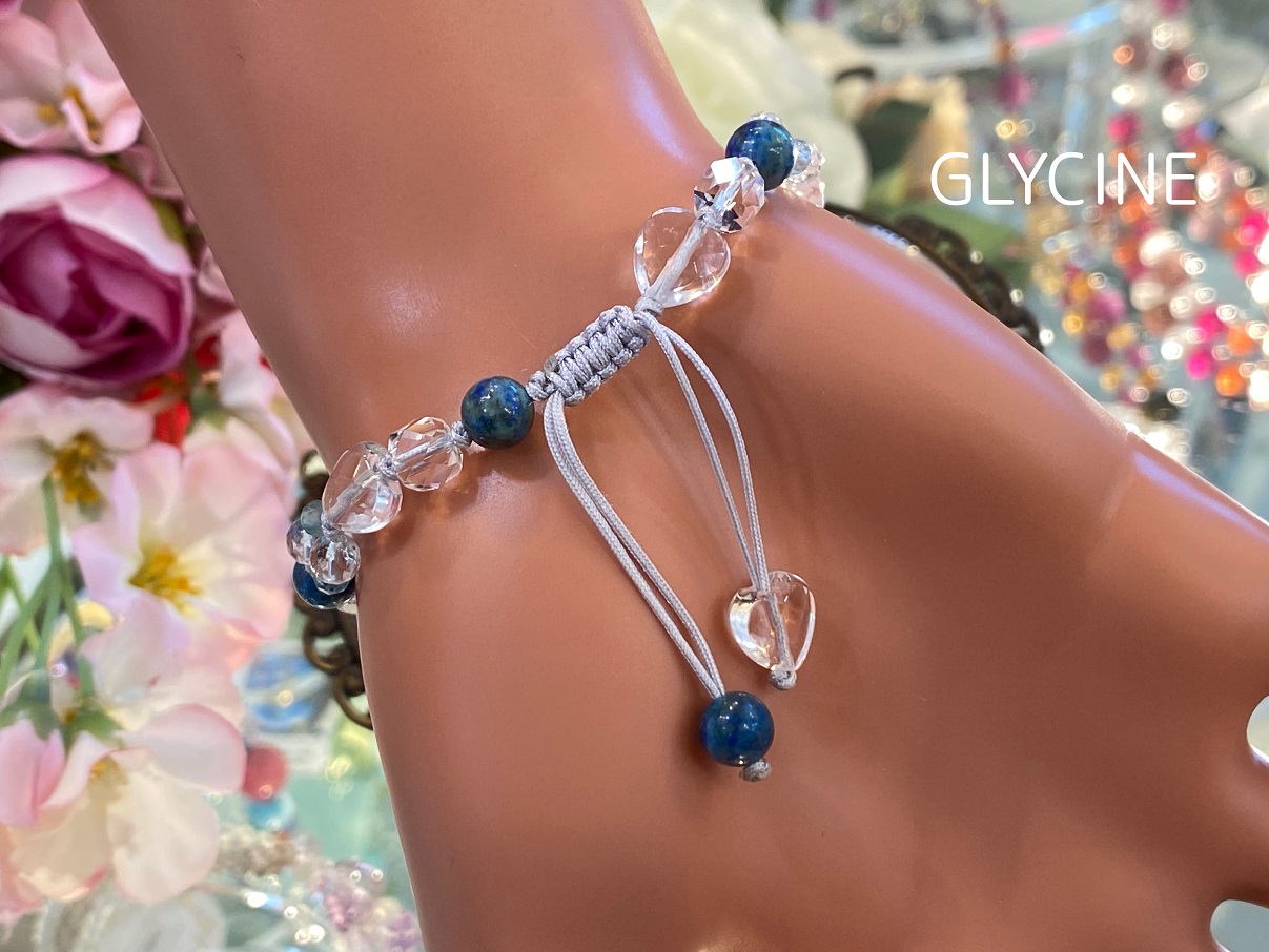 アズライトマラカイトとアパタイトと水晶の3種類の天然石でデザインした透明感のある水色のパワーストーンブレスレットと、