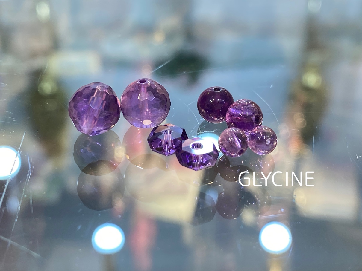 濃すぎない紫色のアメジストの丸玉にカットが施された8ミリ粒と