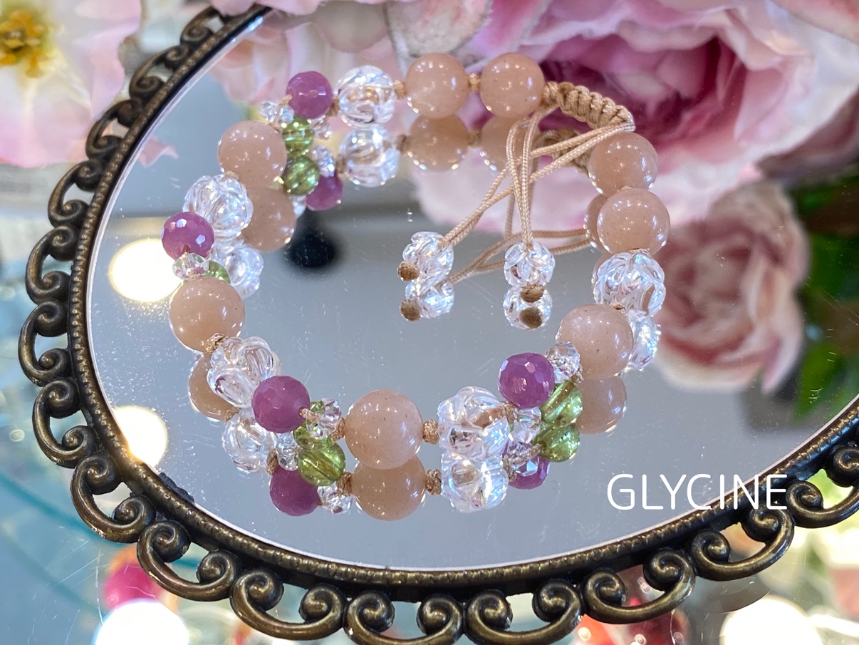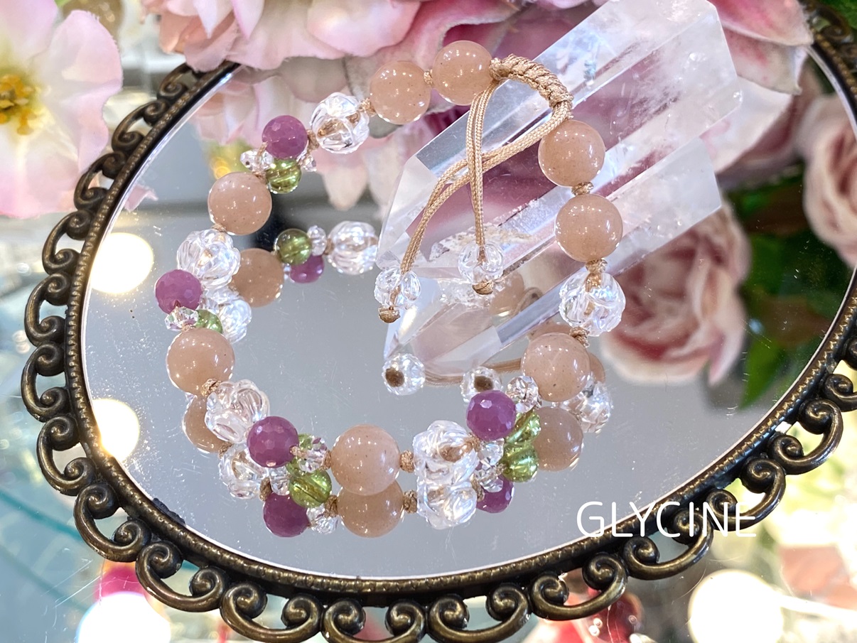 ペリドット、ルビー、ムーンストーン、水晶の4種類の天然石でデザインしたパワーストーンブレスレットは、普段使いしやすいサイズ感とお色合わせに意識して、魅力的だけどシンプルな感じにしました。