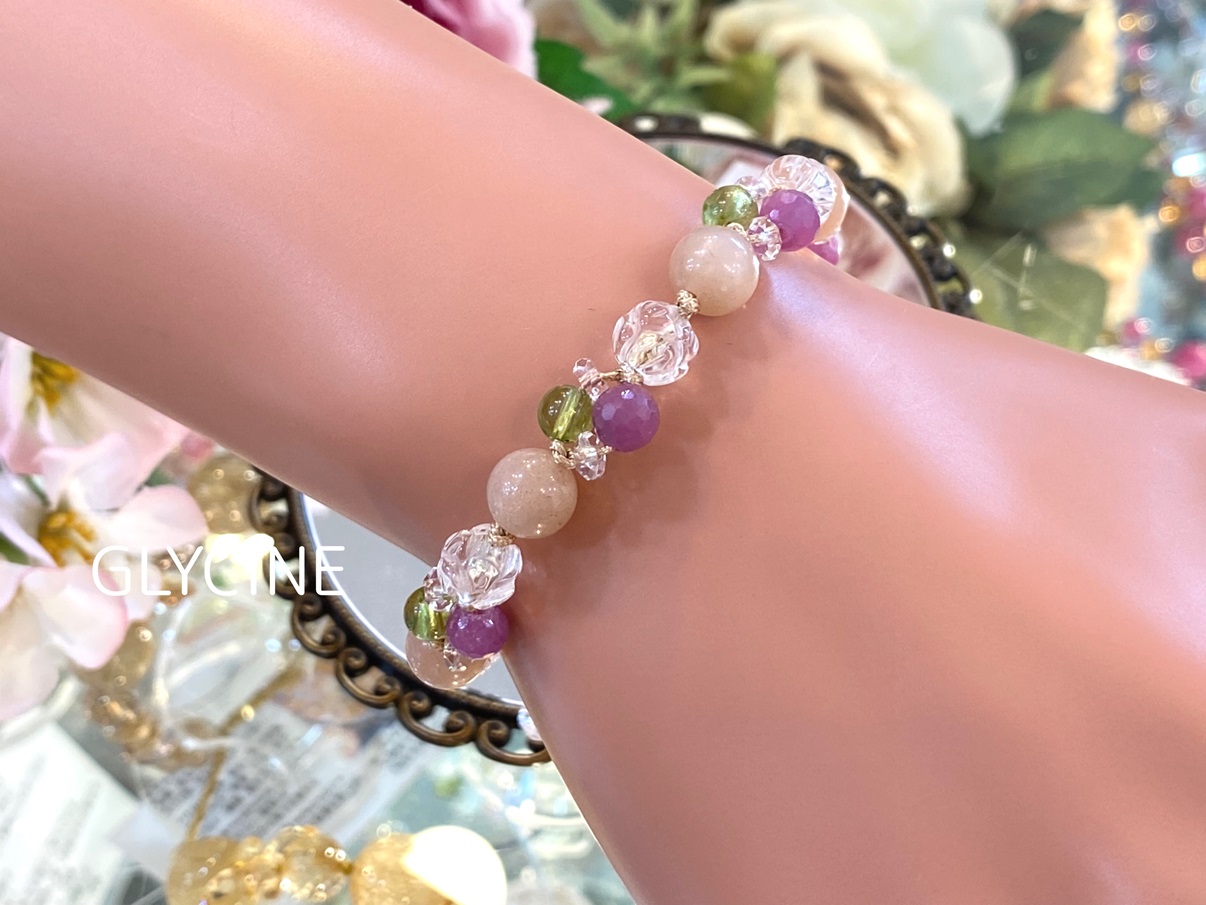 ペリドット、ルビー、ムーンストーン、水晶の4種類の天然石でデザインしたパワーストーンブレスレットです。