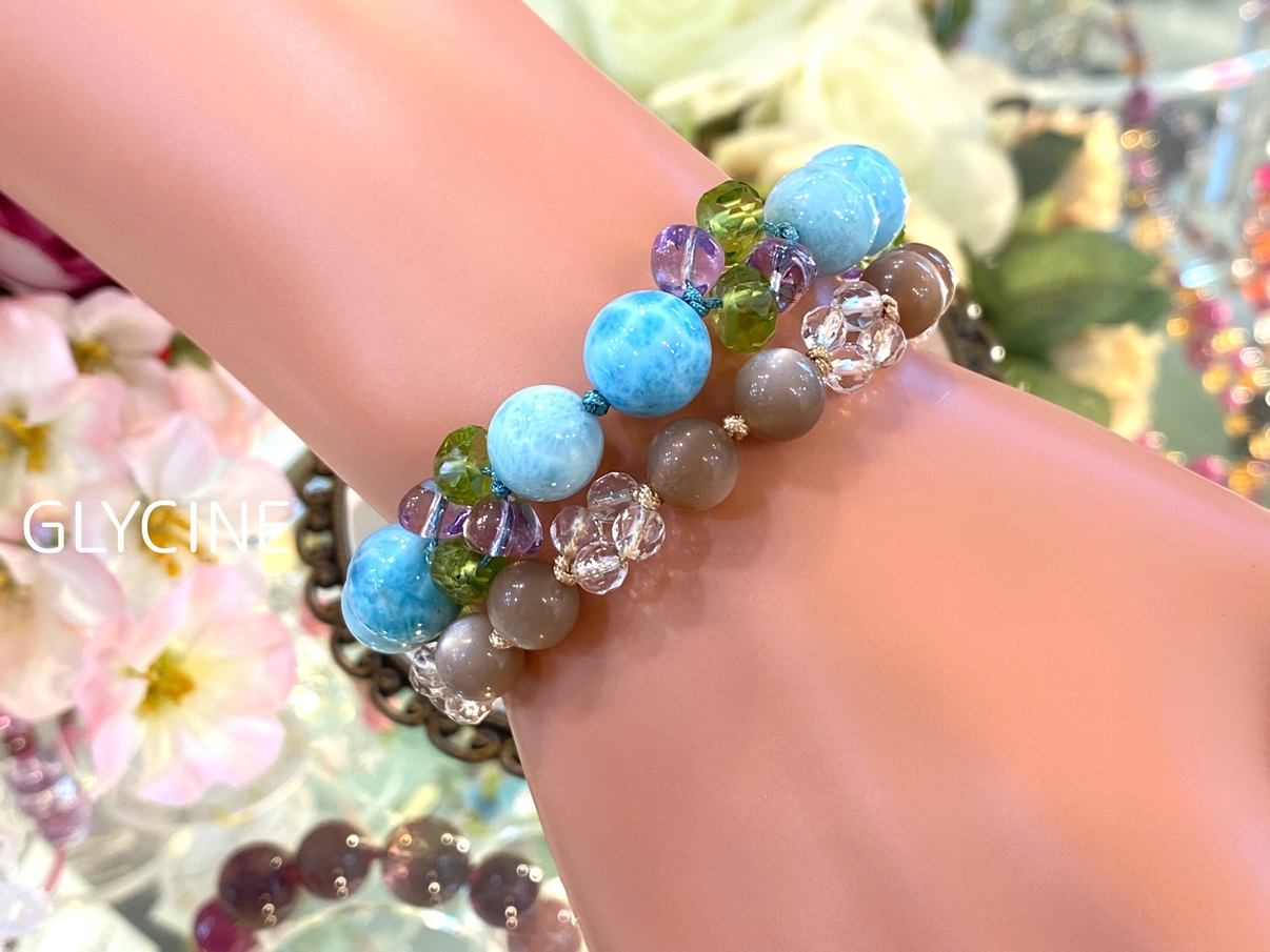 ラリマー、アメジスト、ペリドットの3種類の天然石でデザインしたパワーストーンブレスレットとの重ね着けコーデ写真です。