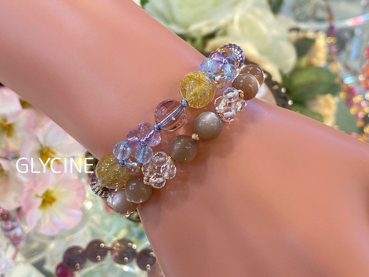 ルチルクォーツ、アメトリン、ブルートパーズの3種類の天然石でデザインしたパワーストーンブレスレットとの重ね着けコーデ写真です。