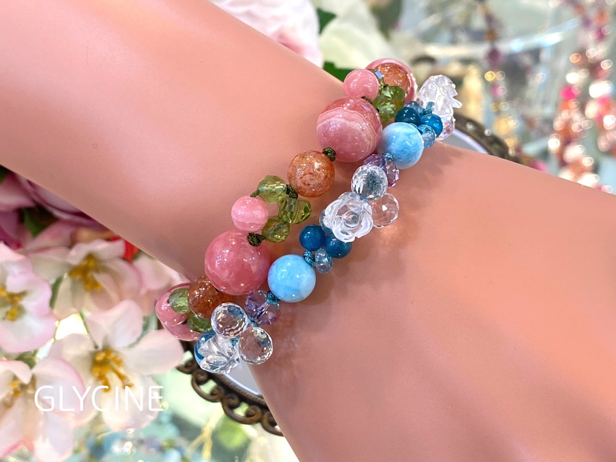 ブルーカルセドニー、ムーンストーン、ペリドット、アクアマリン、水晶の5種類の天然石でデザインした一点物のパワーストーンブレスレットとの重ね着けコーデ写真です。