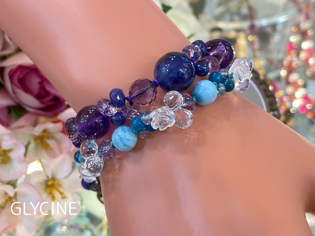 サファイアとアメジストの2種類の天然石でデザインした一点物のパワーストーンブレスレットとの重ね着けコーデ写真です。