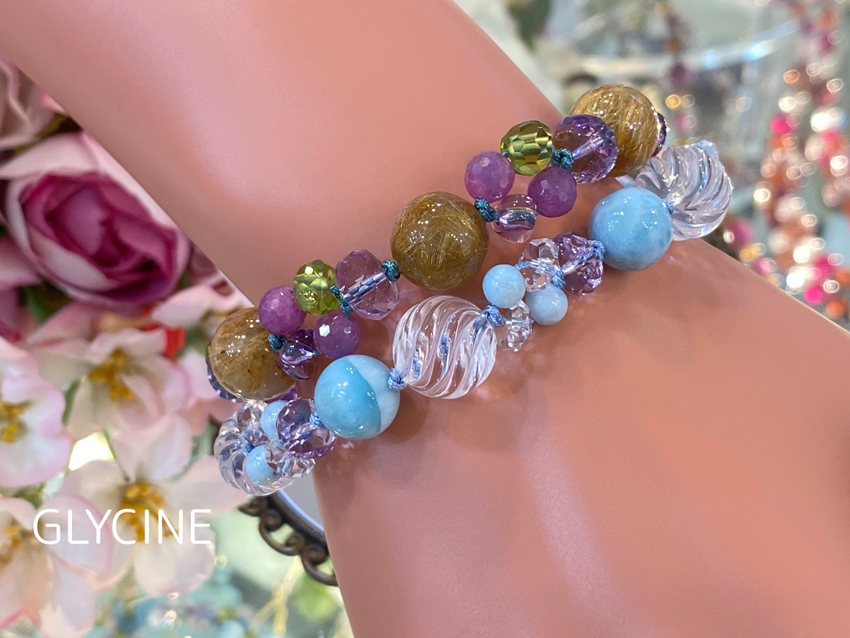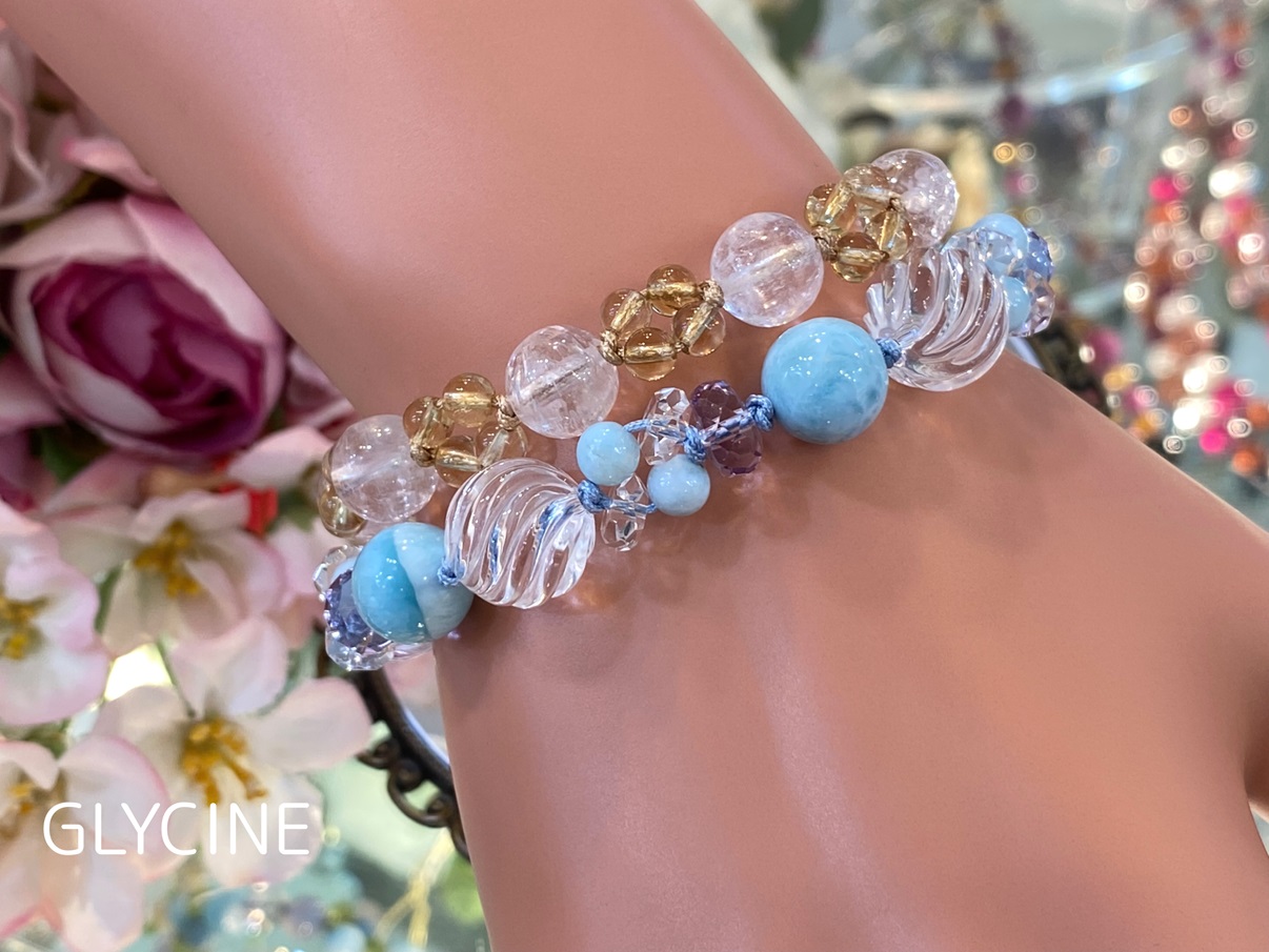 ご紹介中の新作のパワーストーンブレスレットに使ったラリマー、アメジスト、水晶はこちらです。