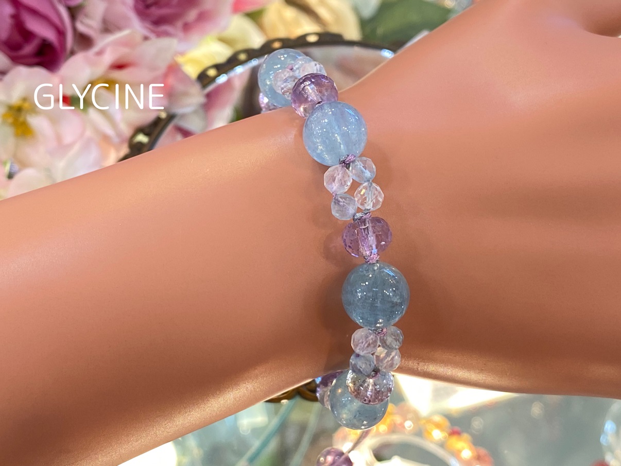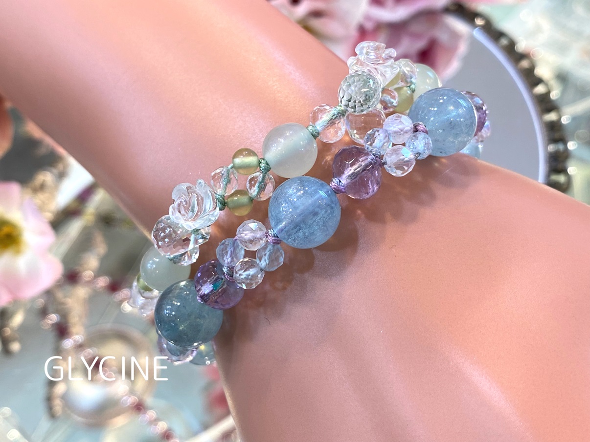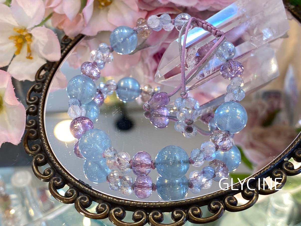 優しい水色のパワーストーンブレスレットに仕上げたかったので、