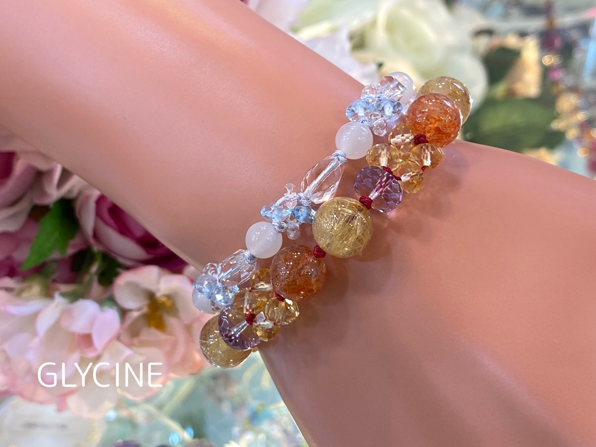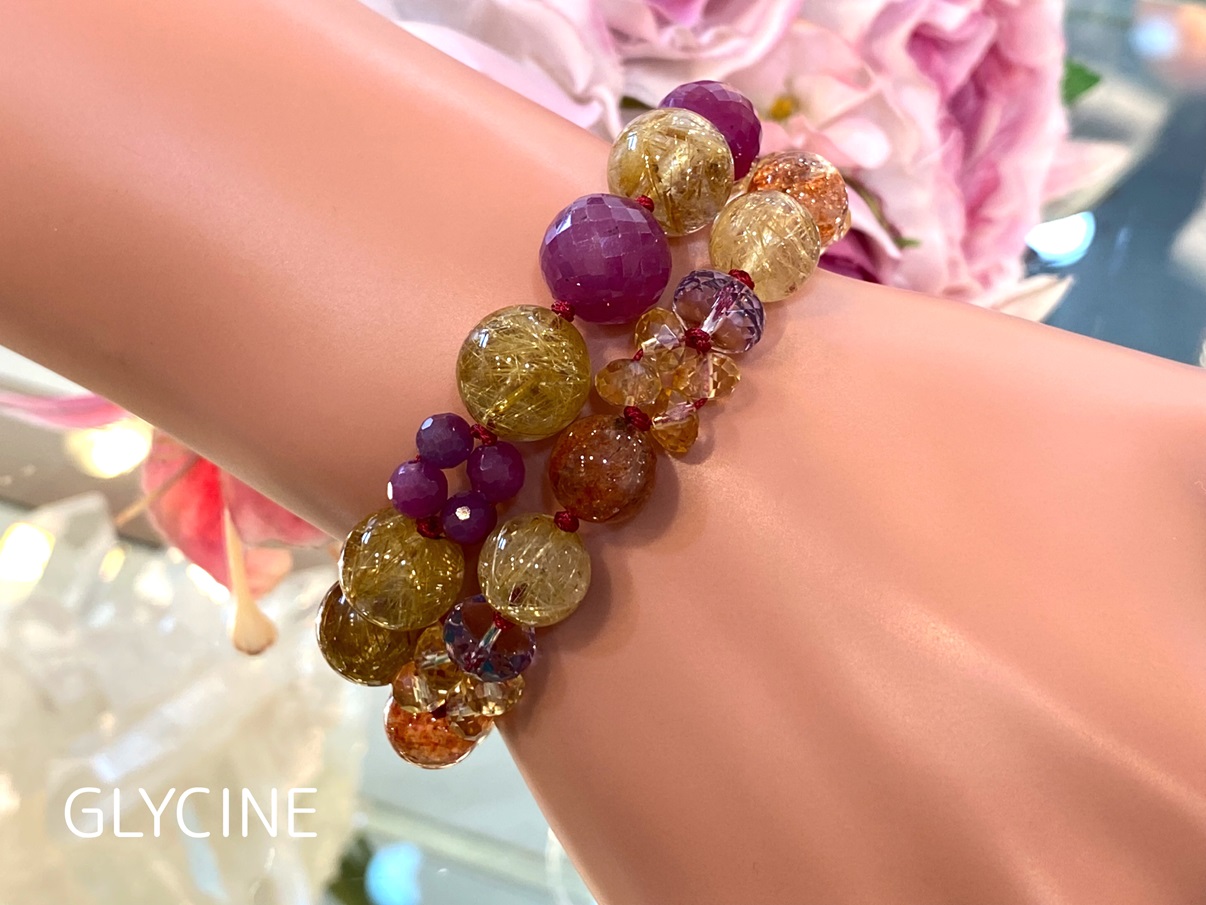 ルチルクォーツとルビーのギラギラな煌めきにうっとりするパワーストーンブレスレットとの重ね着けコーデ写真です。