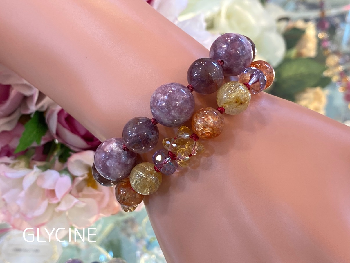 レピドライトオーラライトの2種類の天然石でデザインしたパワーストーンブレスレットとの重ね着けコーデ写真です。