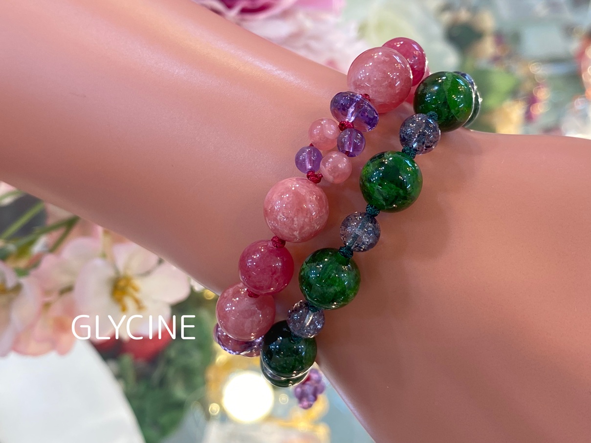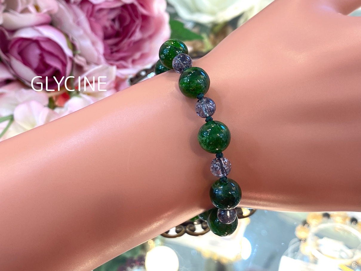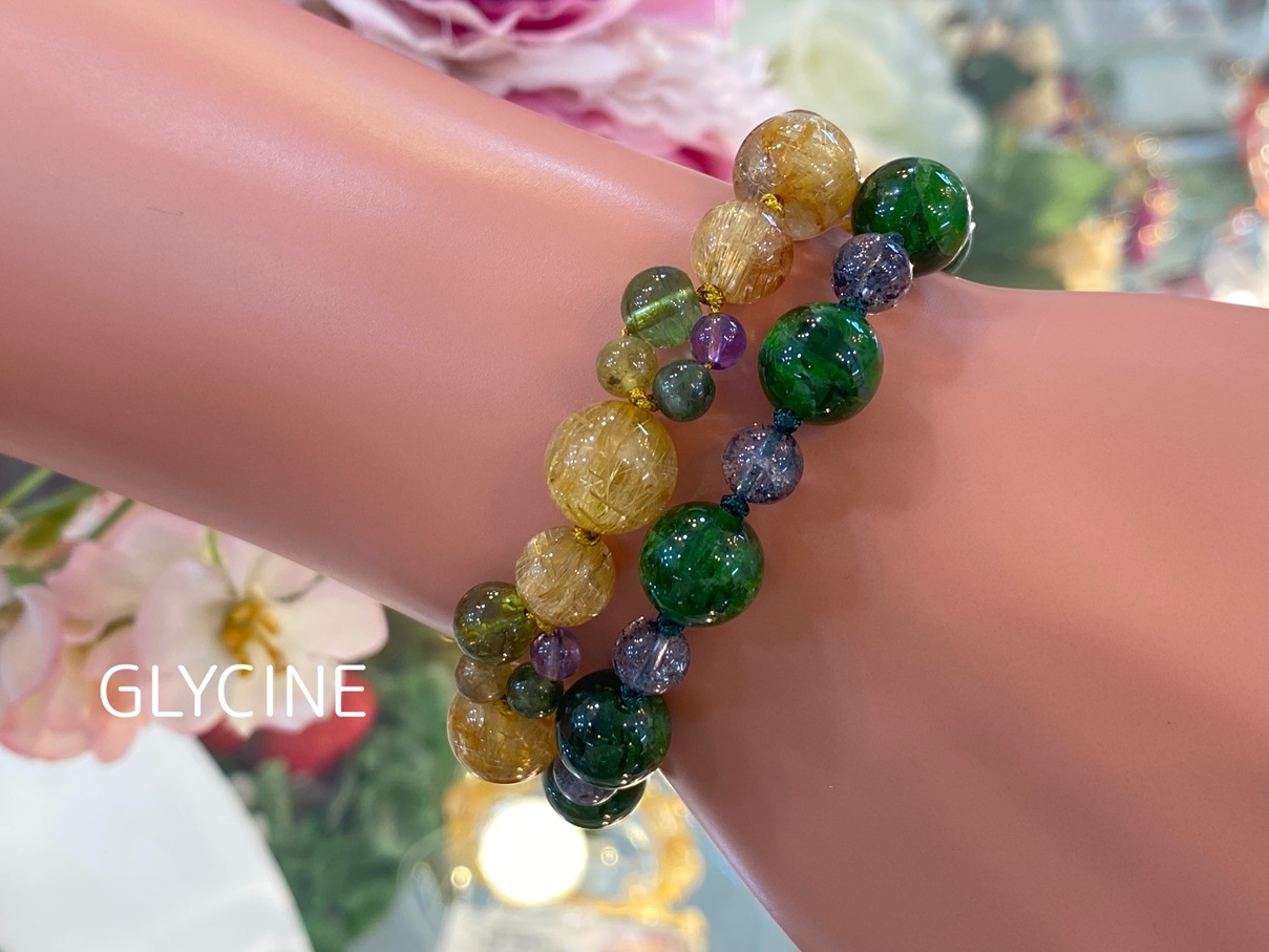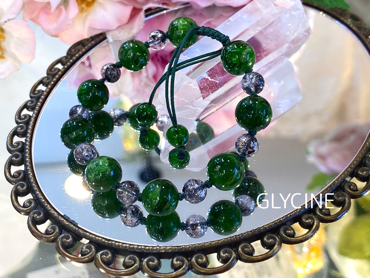 ご紹介中の新作のパワーストーンブレスレットに使ったクロムダイオプサイドとマイカインクォーツはこちらです。