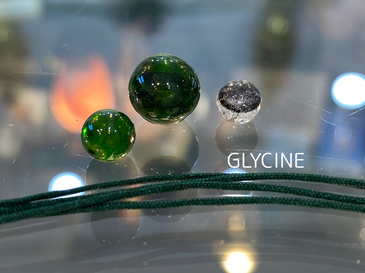 写真手前の小さい方の丸玉はぷらぷら部分に使ったクロムダイオプサイドです。
