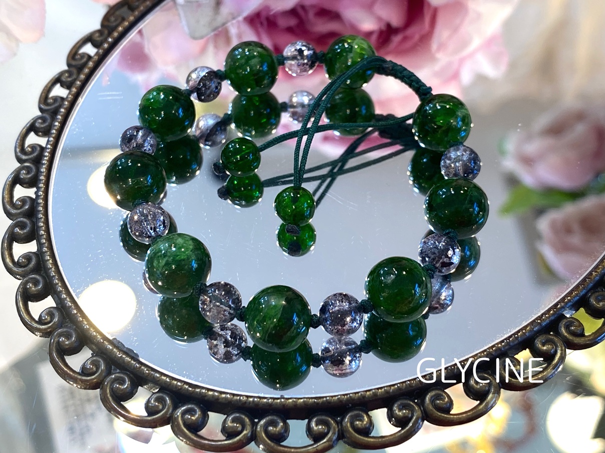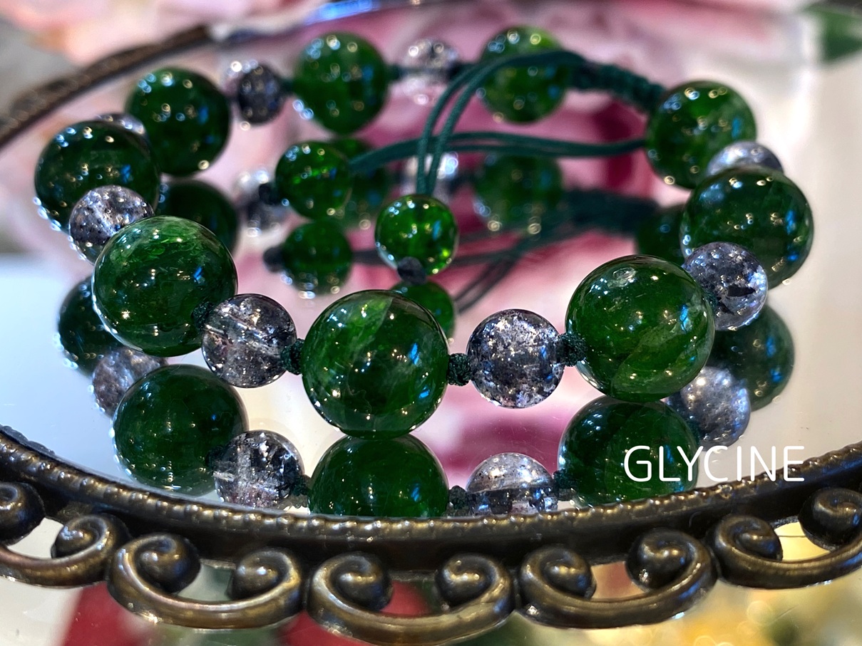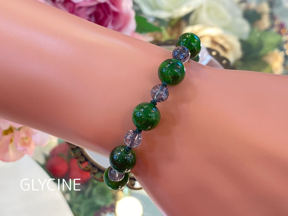 クロムダイオプサイドとマイカインクォーツの2種類の天然石でデザインしたパワーストーンブレスレットです。