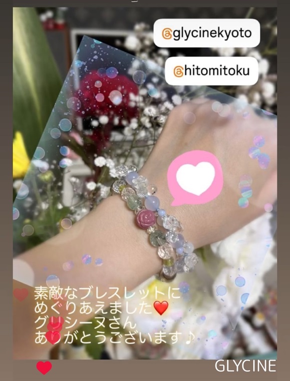 ご自身でデザインされたゴムタイプのパワーストーンブレスレットと一緒に、Glycine(グリシーヌ)のパワーストーンブレスレットを着けていただいての投稿です。